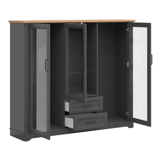 Toya Large Showcase Cabinet with Glass Doors and Drawers - Graphite / Artisan Oak