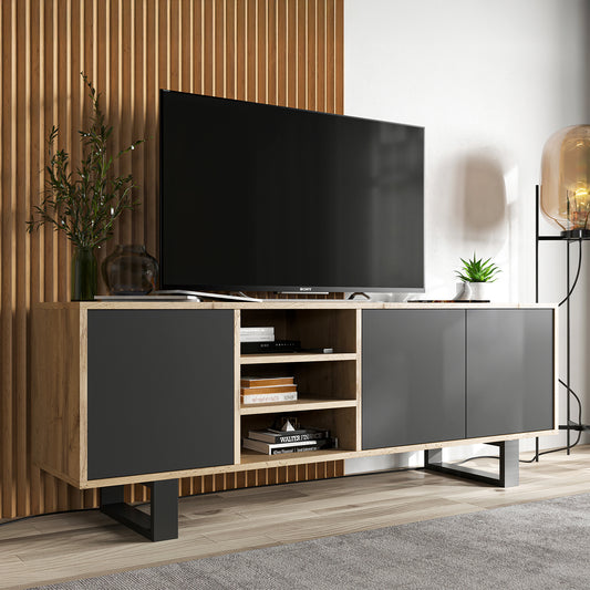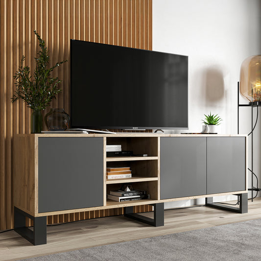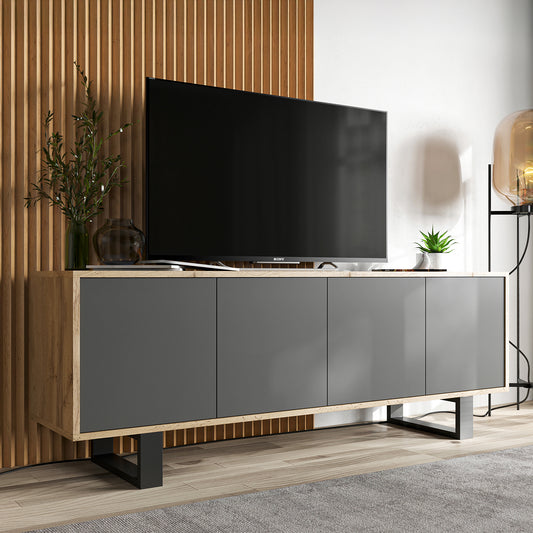 Apollo Modern TV Unit with 4-Door Design and Metal Base 150 cm – Grey / Oak Wotan