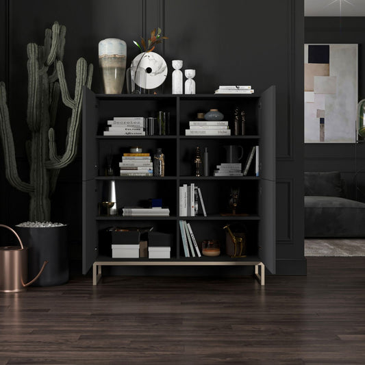 Elpis Glamour 4 Door Sideboard Push-to-Open Cabinet - Black Matt / Golden Frame