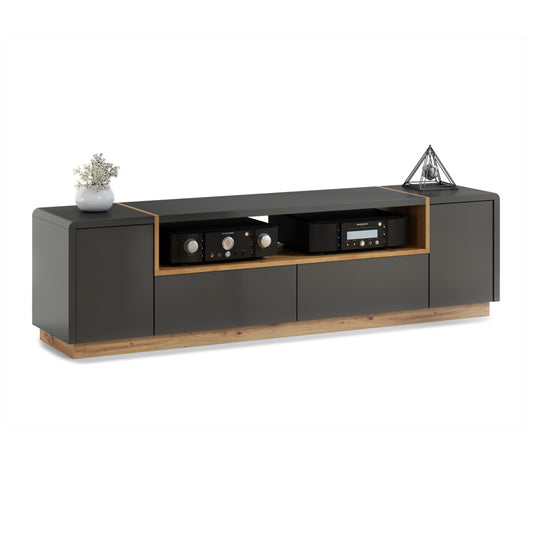 Folk Modern Loft Style Szeroka Szafka RTV z Otwartą Półką – Antracyt / Dąb Artisan