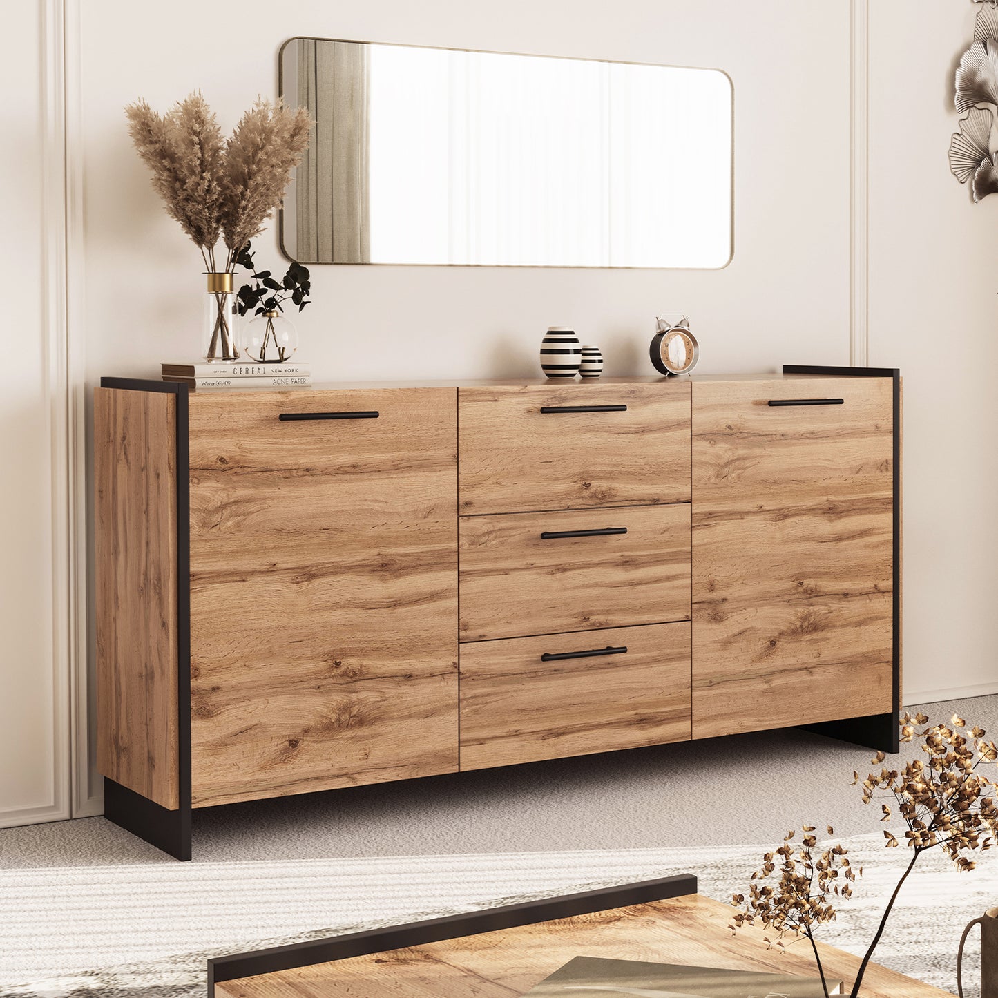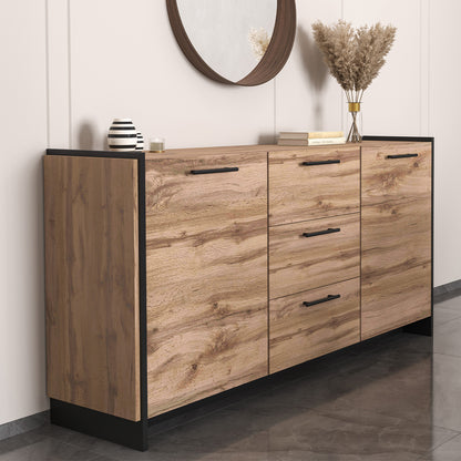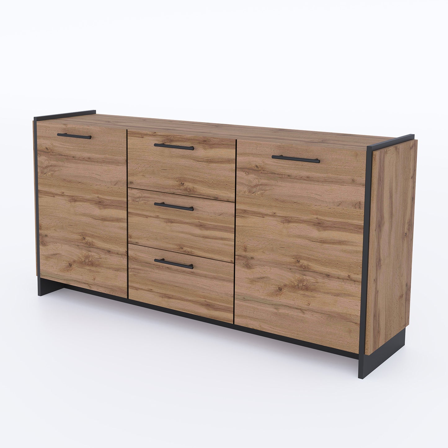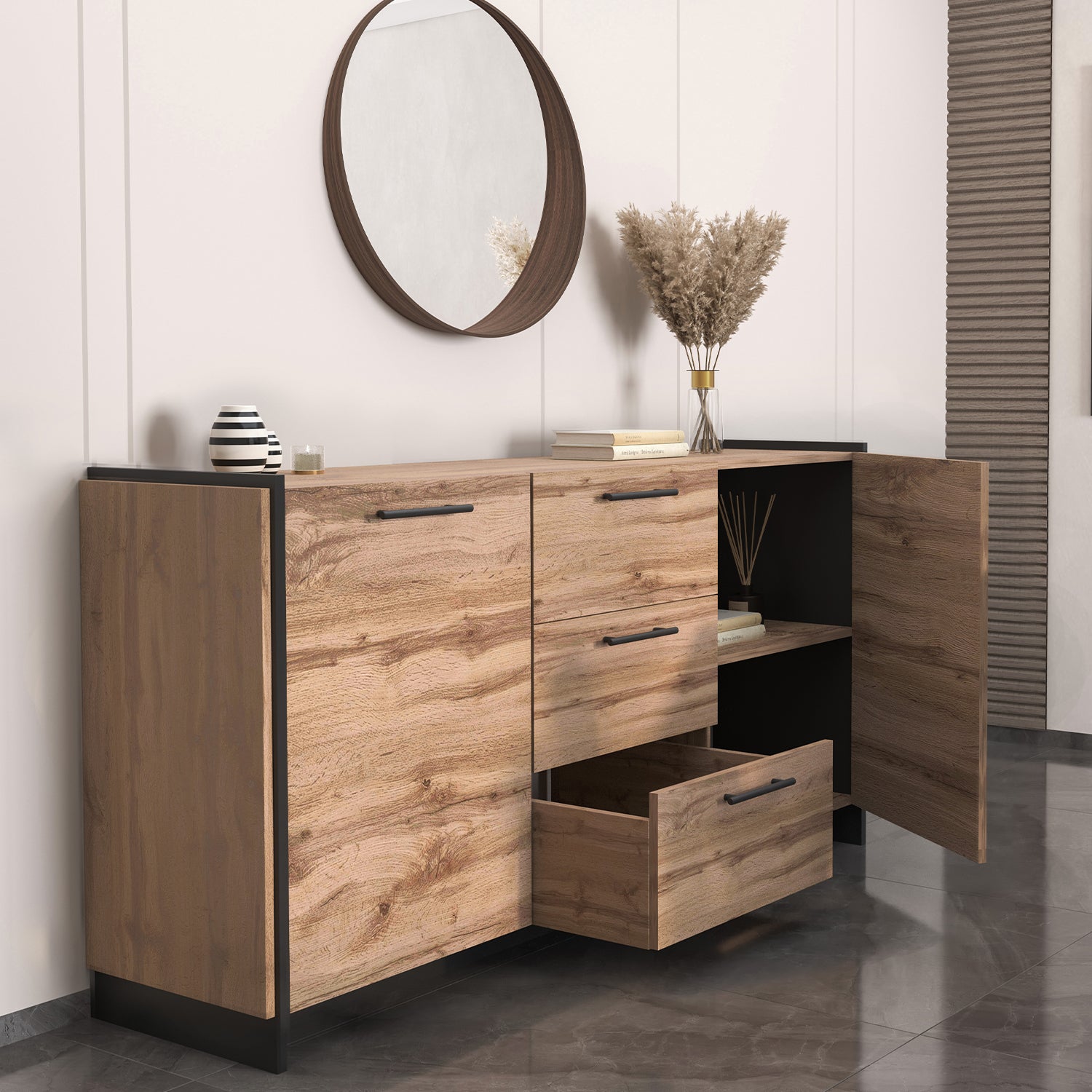 Komoda Amino to nie tylko praktyczne miejsce do przechowywania, ale również elegancka ozdoba sypialni lub salonu. Połączenie dębu wotan i czarnych akcentów nadaje jej nowoczesny, stylowy wygląd. Dzięki szufladom i półkom z łatwością uporządkujesz codzienne przedmioty, zachowując ład i estetykę wnętrza.