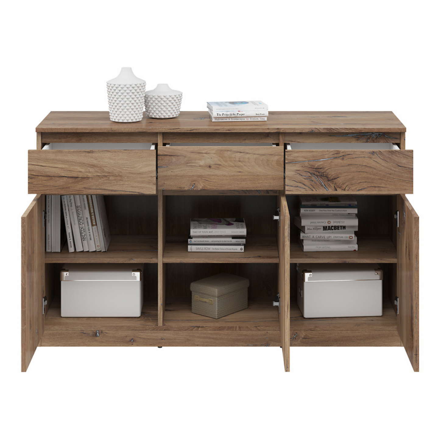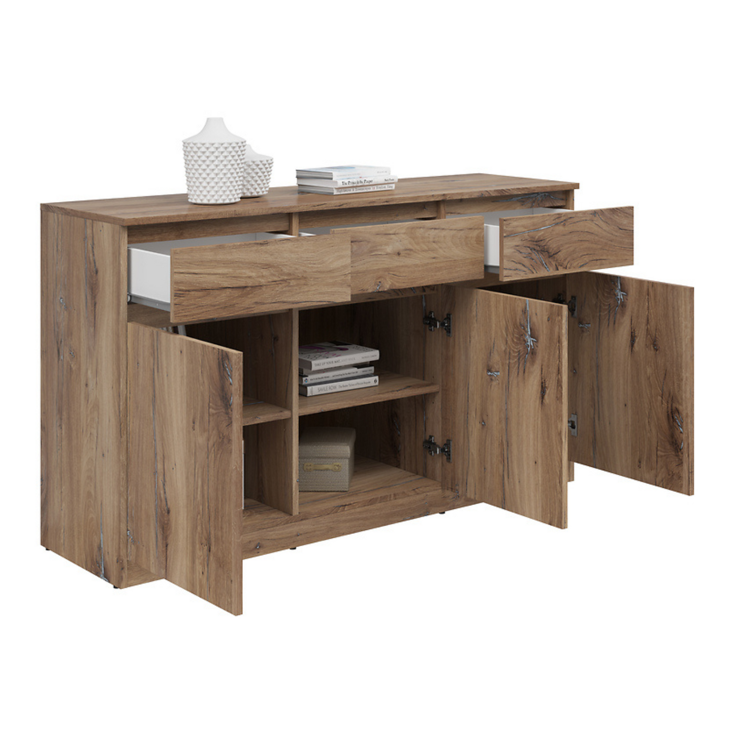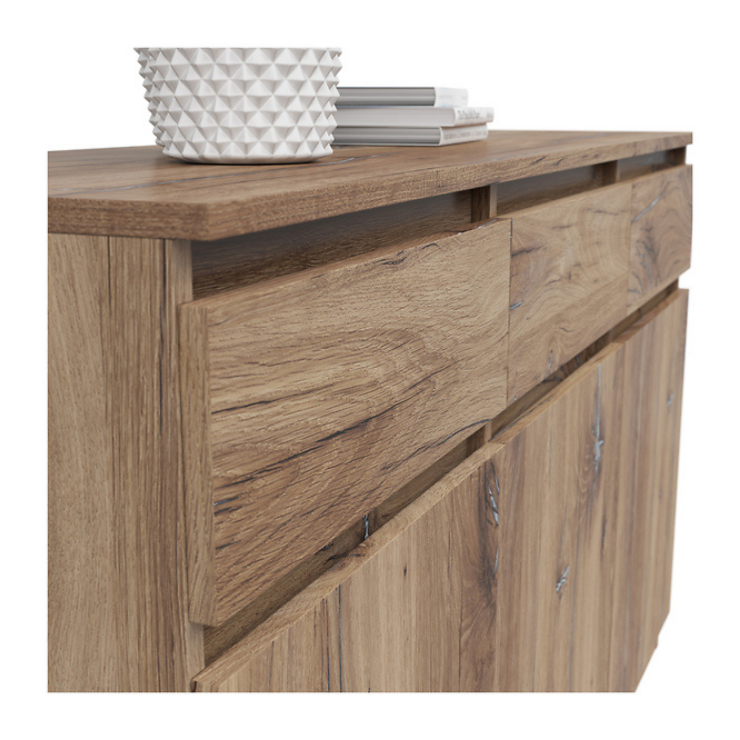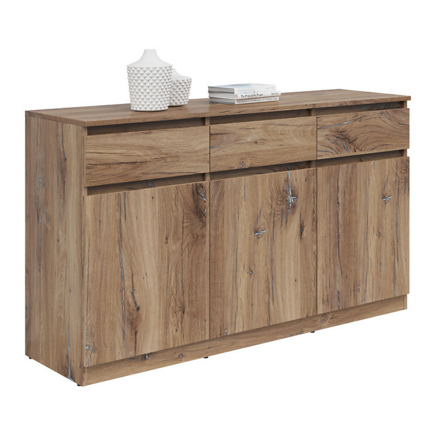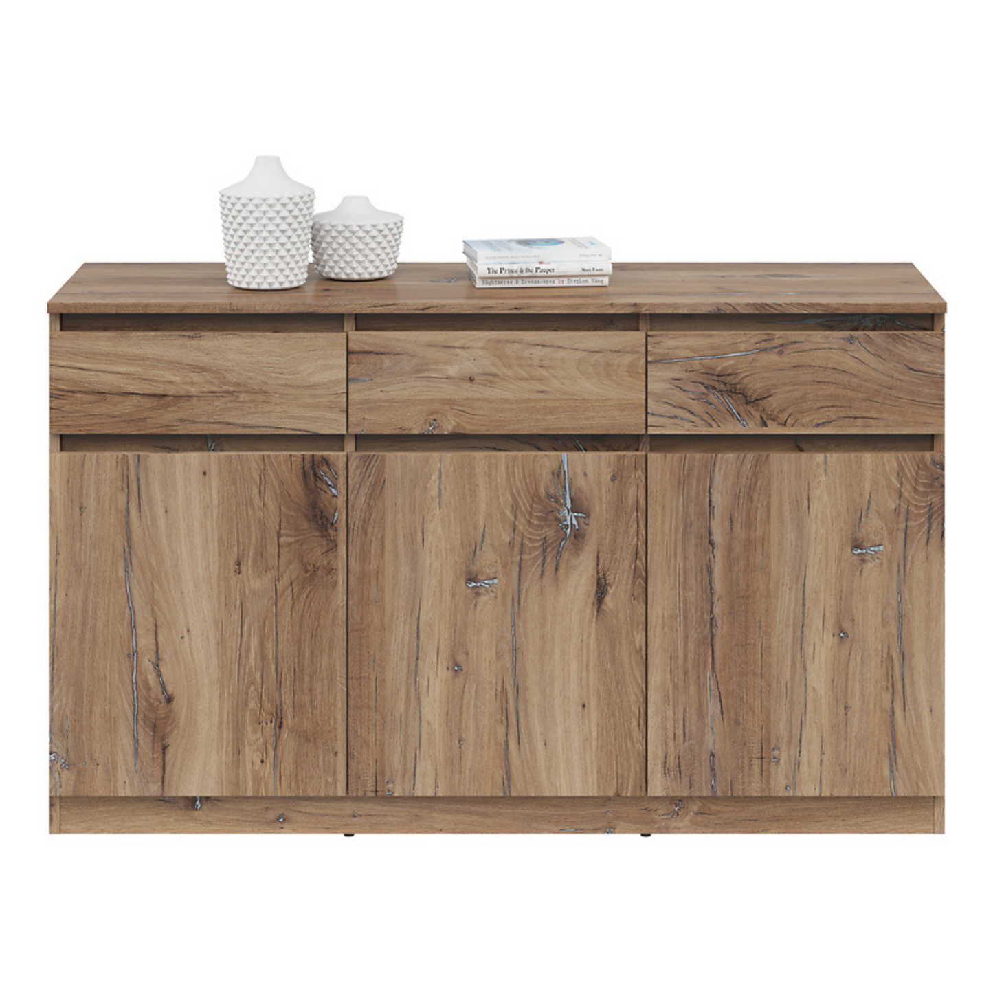 Komoda Ares 135 cm z 3 drzwiami i 3 szufladami to nowoczesny i funkcjonalny wybór dla osób poszukujących praktycznego miejsca do przechowywania w połączeniu ze współczesnym designem. Wyposażona w trzy uchylne fronty i trzy pojemne szuflady, oferuje dużo przestrzeni do przechowywania niezbędnych przedmiotów w uporządkowany sposób. Solidna konstrukcja zapewnia trwałość i niezawodność na lata. Dostępna w kilku wariantach kolorystycznych, doskonale sprawdzi się u osób ceniących sobie zarówno uniwersalność, jak i styl w aranżacji wnętrz.