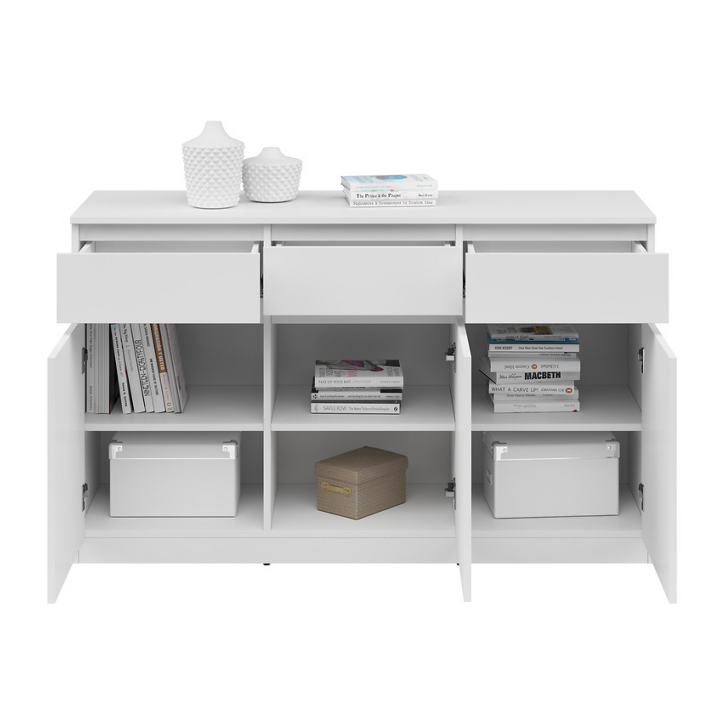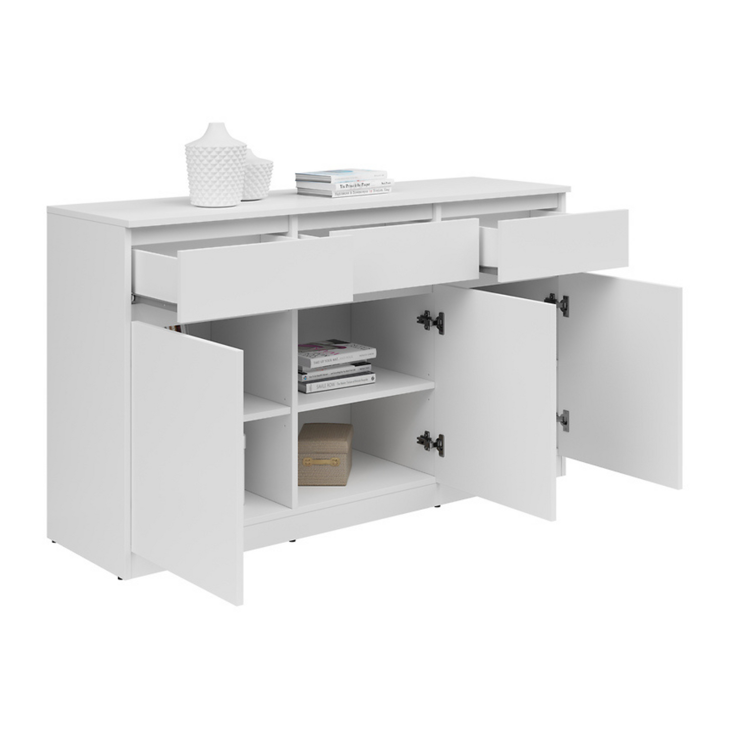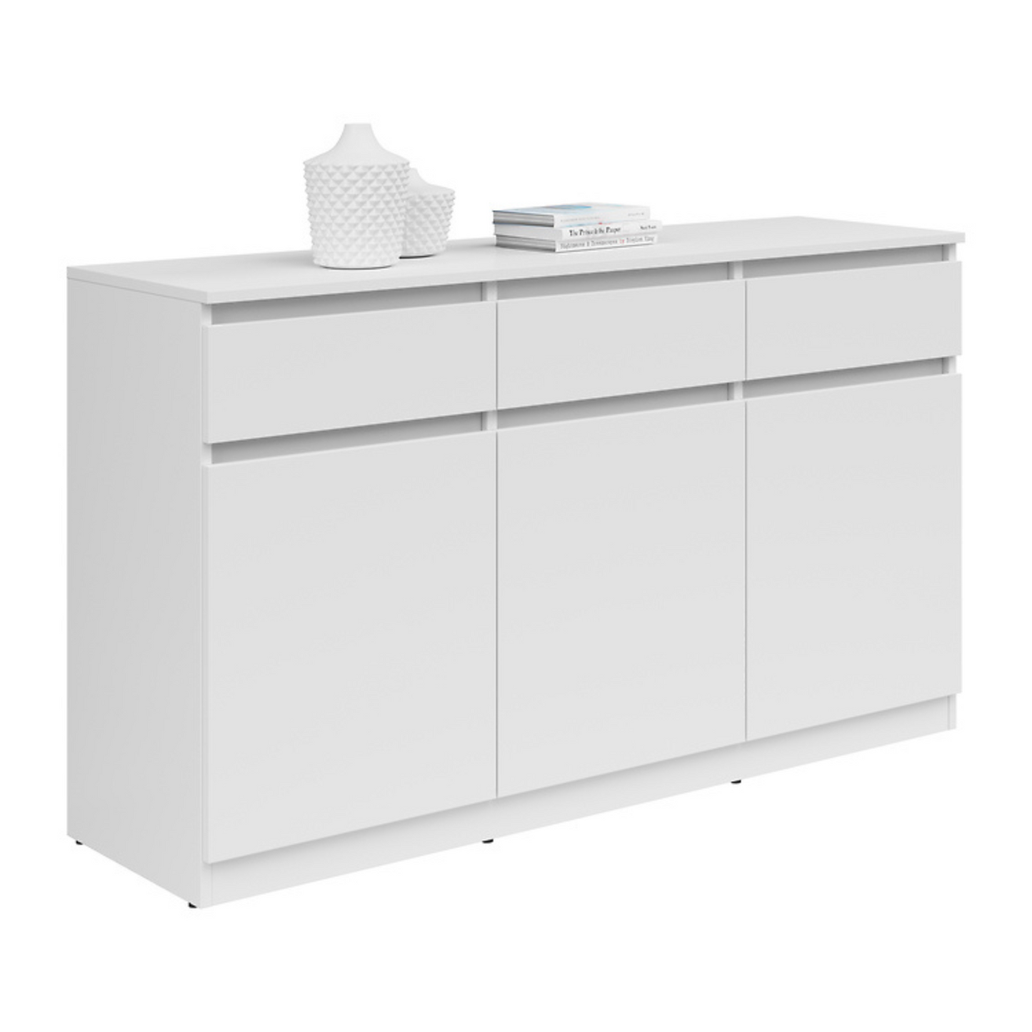Komoda Ares 135 cm z 3 drzwiami i 3 szufladami to nowoczesny i funkcjonalny wybór dla osób poszukujących praktycznego miejsca do przechowywania w połączeniu ze współczesnym designem. Wyposażona w trzy uchylne fronty i trzy pojemne szuflady, oferuje dużo przestrzeni do przechowywania niezbędnych przedmiotów w uporządkowany sposób. Solidna konstrukcja zapewnia trwałość i niezawodność na lata. Dostępna w kilku wariantach kolorystycznych, doskonale sprawdzi się u osób ceniących sobie zarówno uniwersalność, jak i styl w aranżacji wnętrz.