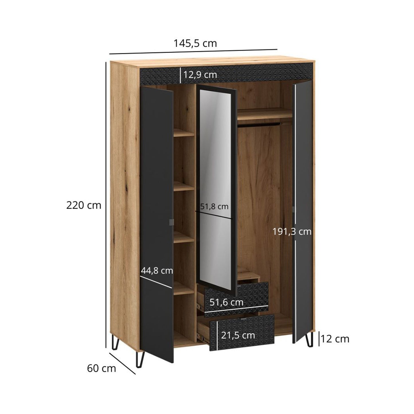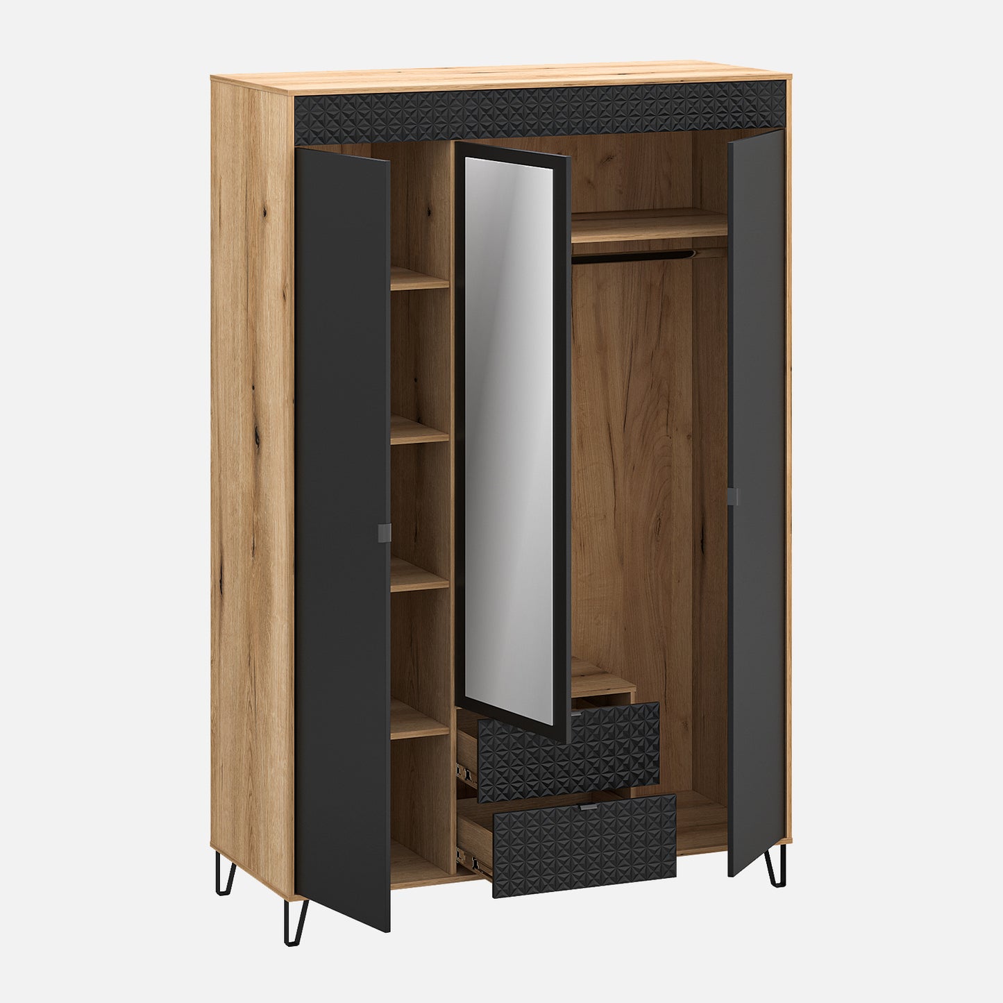 Ta szafa Bellano łączy formę z funkcją, oferując trzy drzwi, dwie szuflady i lustro. Wykończenie w dębie Evok i czerni nadaje sypialni nowoczesny charakter, a przestronne wnętrze pozwala na uporządkowane przechowywanie ubrań, akcesoriów i niezbędnych przedmiotów.