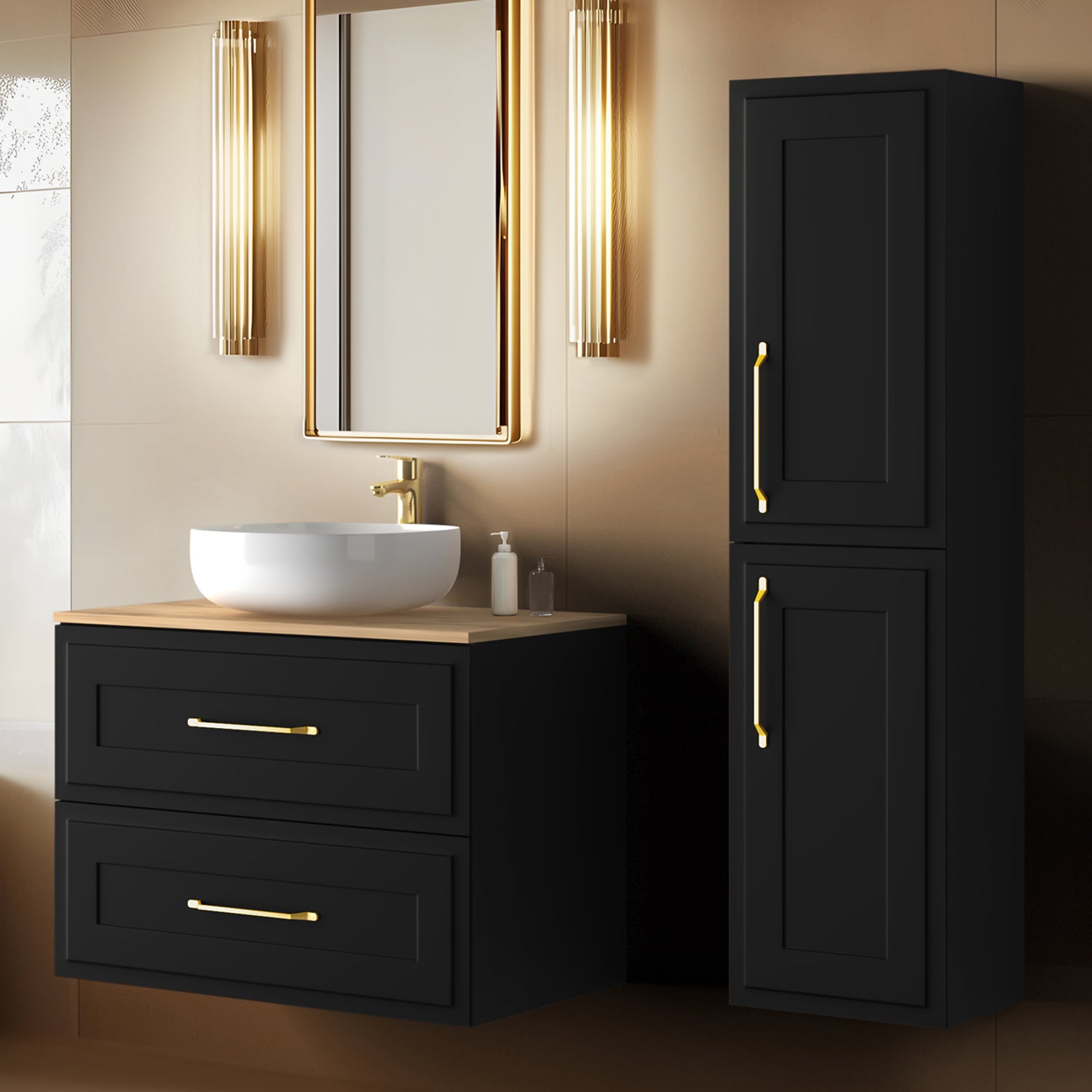 Bring elegance and practicality to your bathroom with this beautifully crafted wall-mounted vanity cabinet set. Featuring a 60cm wide 2-drawer base unit and a tall 136cm cabinet, this set is the perfect combination of style and smart storage for both small and medium-sized bathrooms. The included worktop provides a sleek surface for your choice of countertop basin, adding a premium touch to your bathroom space.