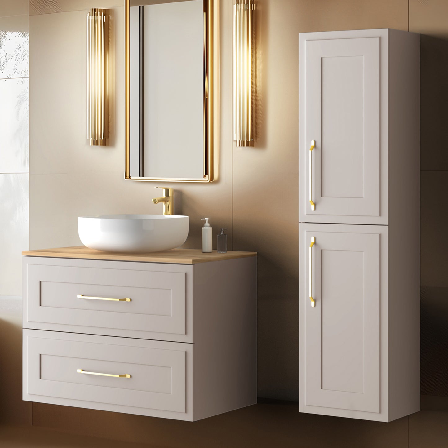 Bring elegance and practicality to your bathroom with this beautifully crafted wall-mounted vanity cabinet set. Featuring a 60cm wide 2-drawer base unit and a tall 136cm cabinet, this set is the perfect combination of style and smart storage for both small and medium-sized bathrooms. The included worktop provides a sleek surface for your choice of countertop basin, adding a premium touch to your bathroom space.