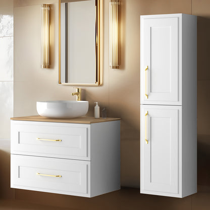 Bring elegance and practicality to your bathroom with this beautifully crafted wall-mounted vanity cabinet set. Featuring a 60cm wide 2-drawer base unit and a tall 136cm cabinet, this set is the perfect combination of style and smart storage for both small and medium-sized bathrooms. The included worktop provides a sleek surface for your choice of countertop basin, adding a premium touch to your bathroom space.