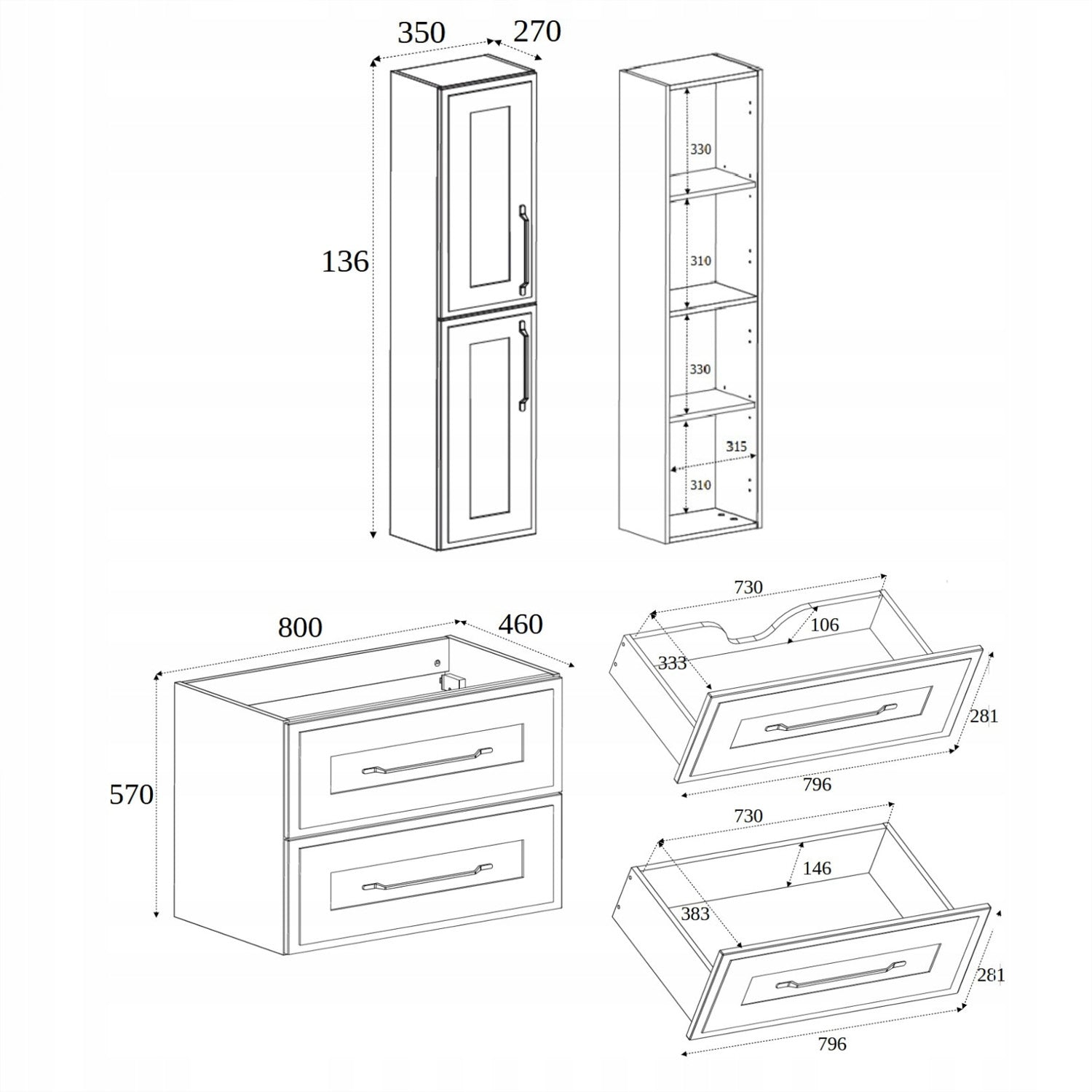 • 2-piece bathroom cabinet set – Includes a drawer vanity base and tall storage cabinet