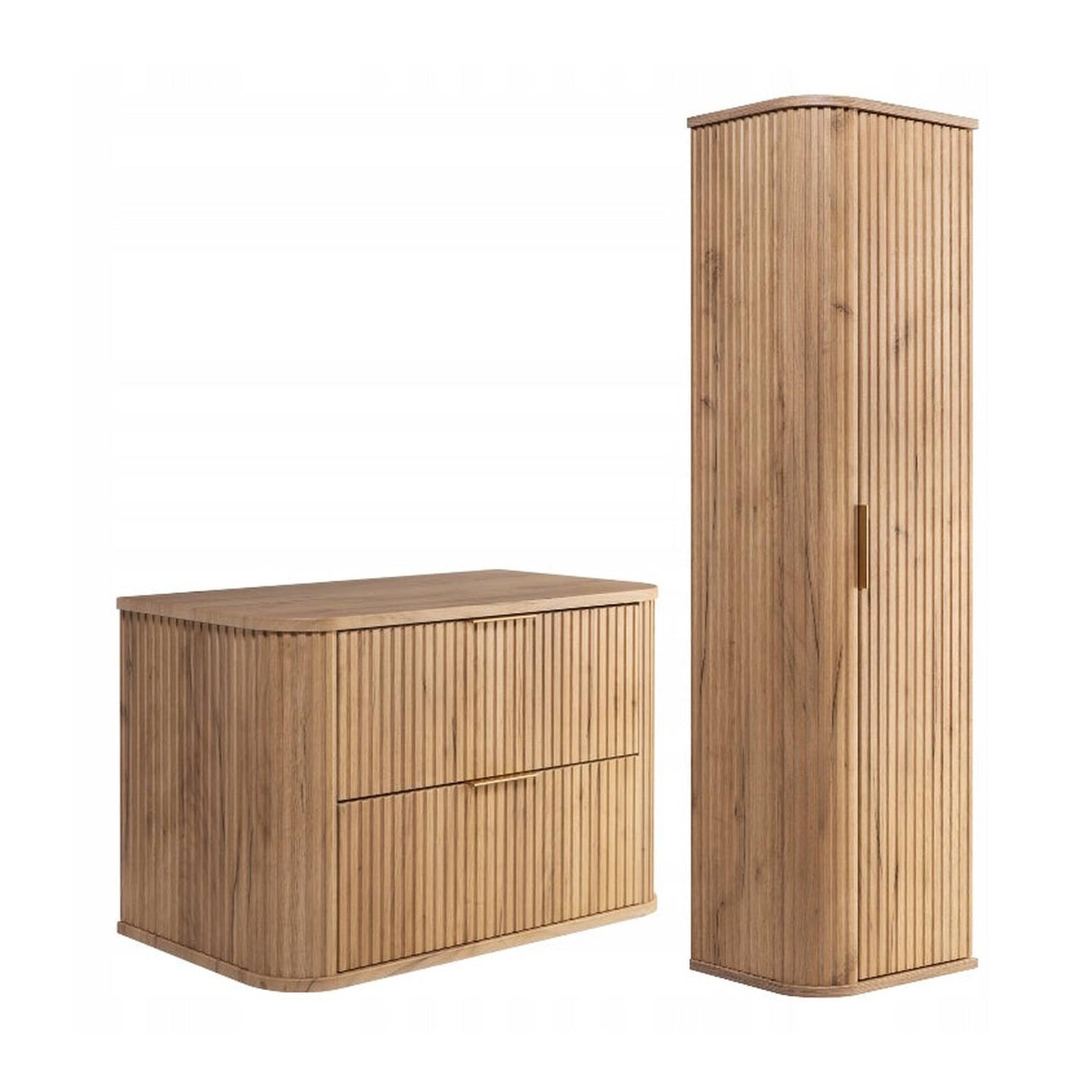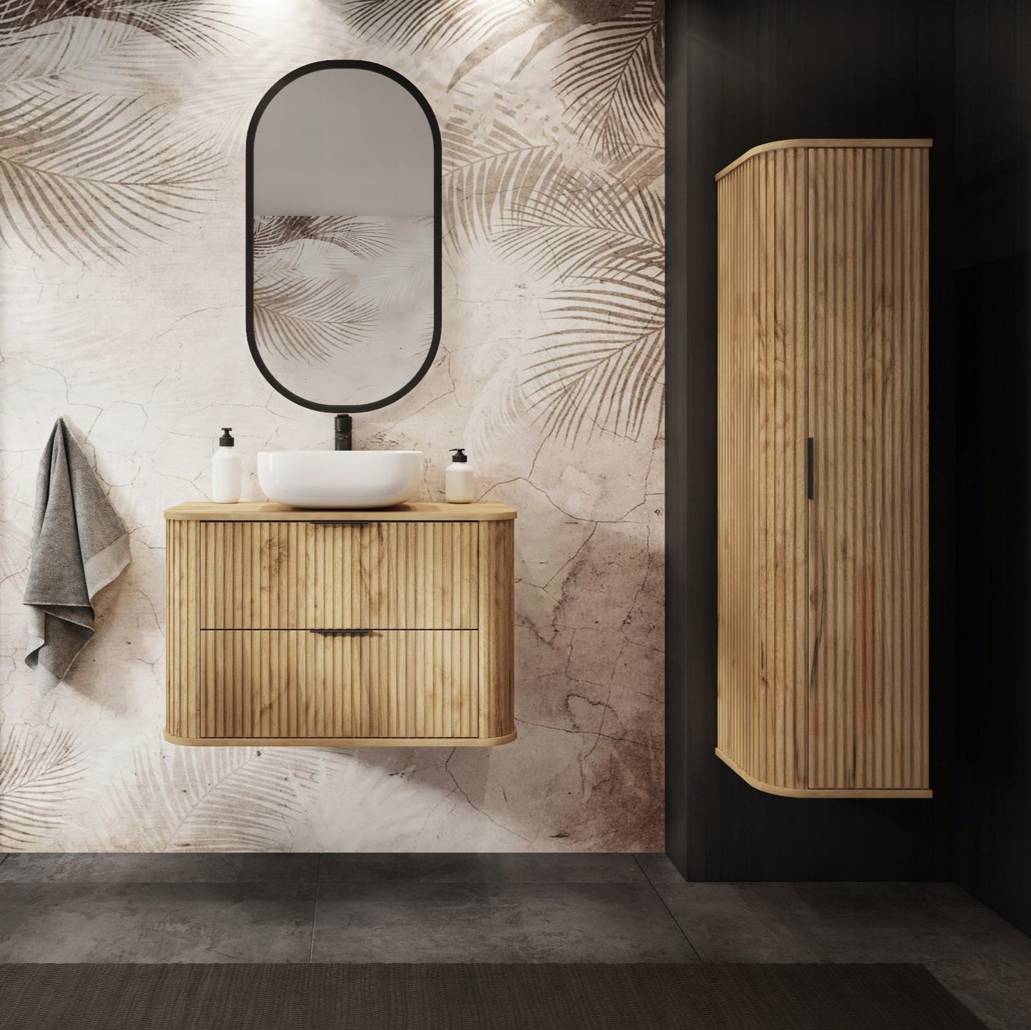 Transform your bathroom with the Elegance Glamour Style 2 Bathroom Wall Cabinets Set.. This stunning set features a 80cm wide cabinet with 2 spacious drawers and a tall 139cm high, 35cm wide cabinet, both designed with a curved finish and textured doors for a luxurious look. The included worktop completes the set, providing a perfect blend of style and practicality and allows you to add a countertop basin. Upgrade your space with this elegant, functional solution that brings both glamour and smart storage to your bathroom.