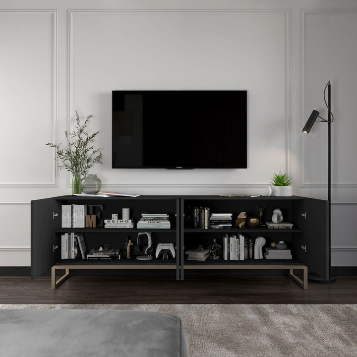 Wprowadź odważny akcent do swojego salonu dzięki szafce RTV Elpis Glamour w eleganckim czarnym macie. Imponująca długość 300 cm sprawia, że mebel ten idealnie nadaje się pod duże telewizory, oferując jednocześnie mnóstwo miejsca do przechowywania. Ryflowane fronty nadają nowoczesnego charakteru, a bezuchwytowy system otwierania podkreśla minimalistyczny i luksusowy styl. Szafka doskonale sprawdzi się jako stolik RTV, konsola medialna lub nowoczesna komoda.