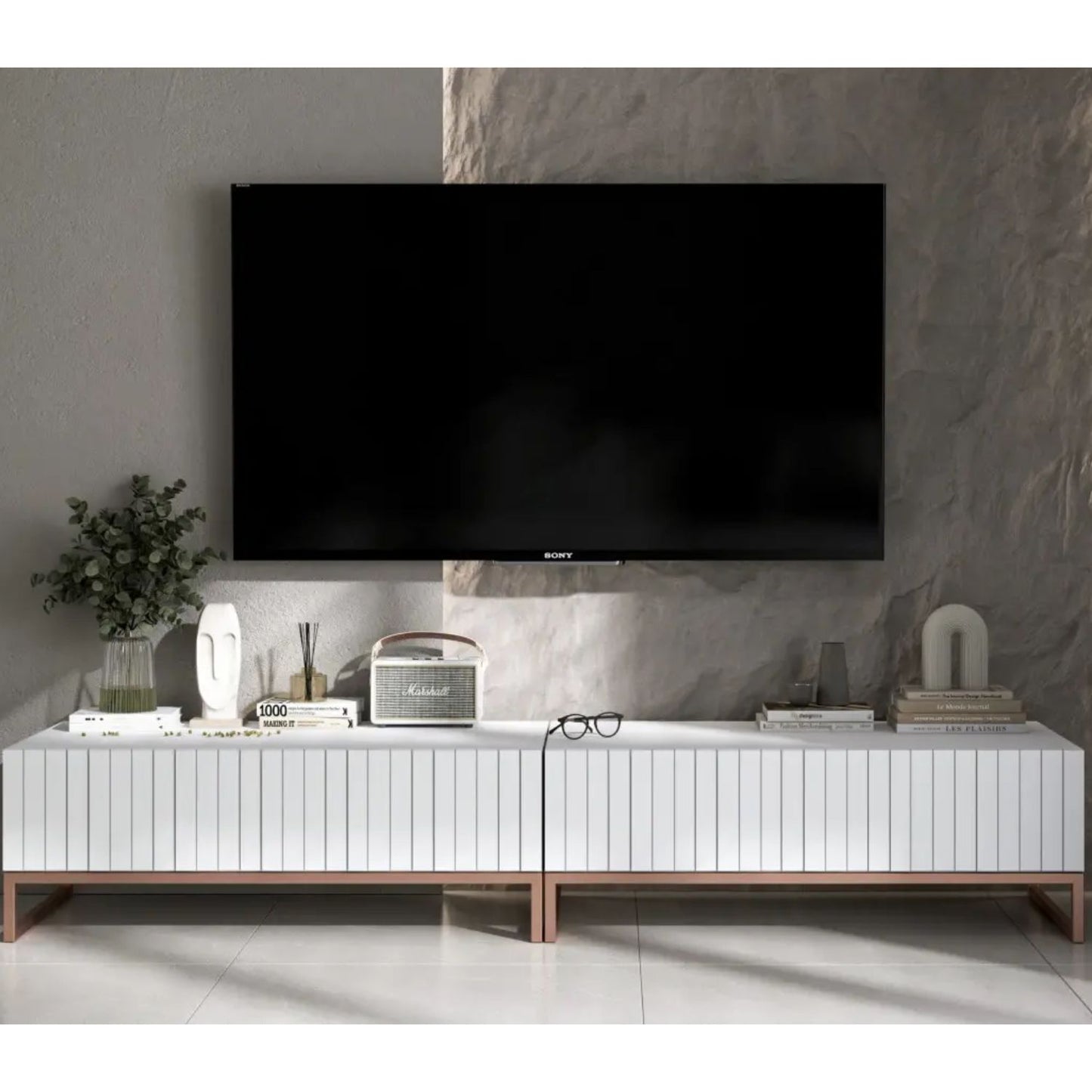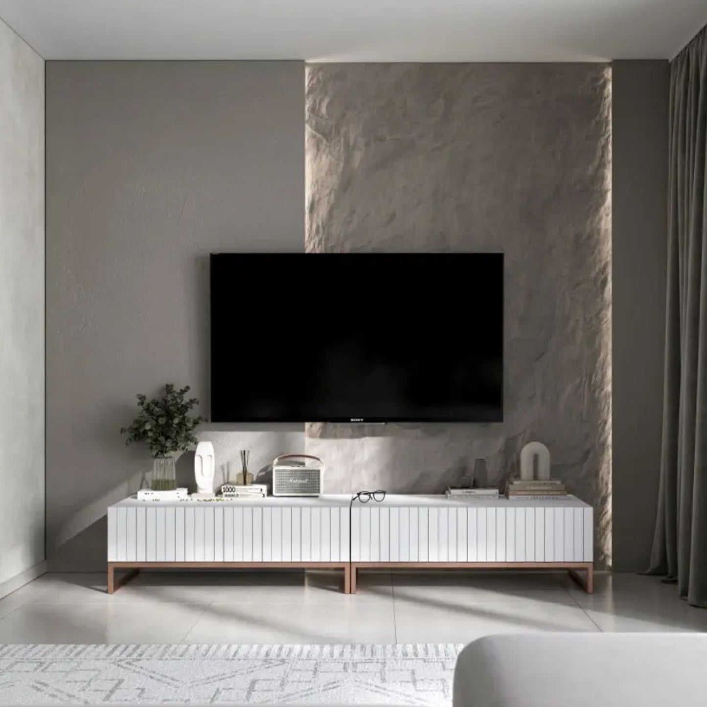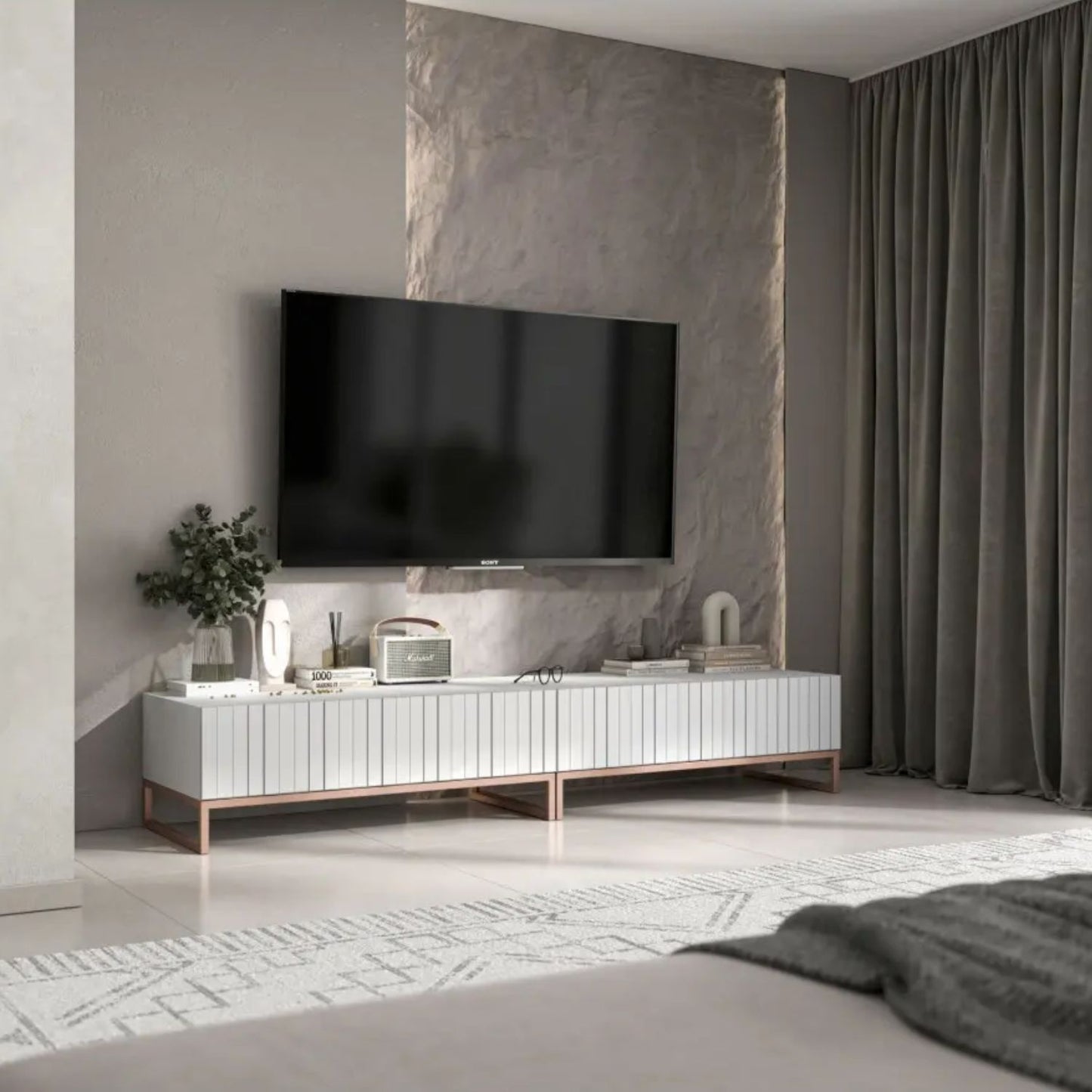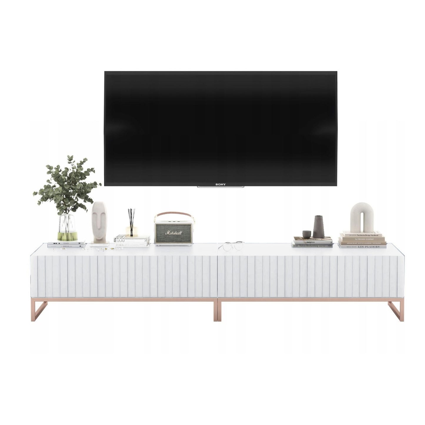 Wprowadź elegancję i nowoczesny styl do swojego wnętrza dzięki uniwersalnej szafce RTV w stylu glamour z wykończeniem w wyrafinowanym białym macie. Jej długość 220 cm zapewnia dużą przestrzeń do przechowywania oraz odważny design, który wyróżnia się w każdej nowoczesnej aranżacji salonu. Ryflowane fronty dodają meblowi charakteru i tekstury, a bezuchwytowe drzwi nadają całości minimalistyczny, elegancki wygląd. Idealna jako szafka pod telewizor, konsola RTV lub dekoracyjna komoda do przechowywania.