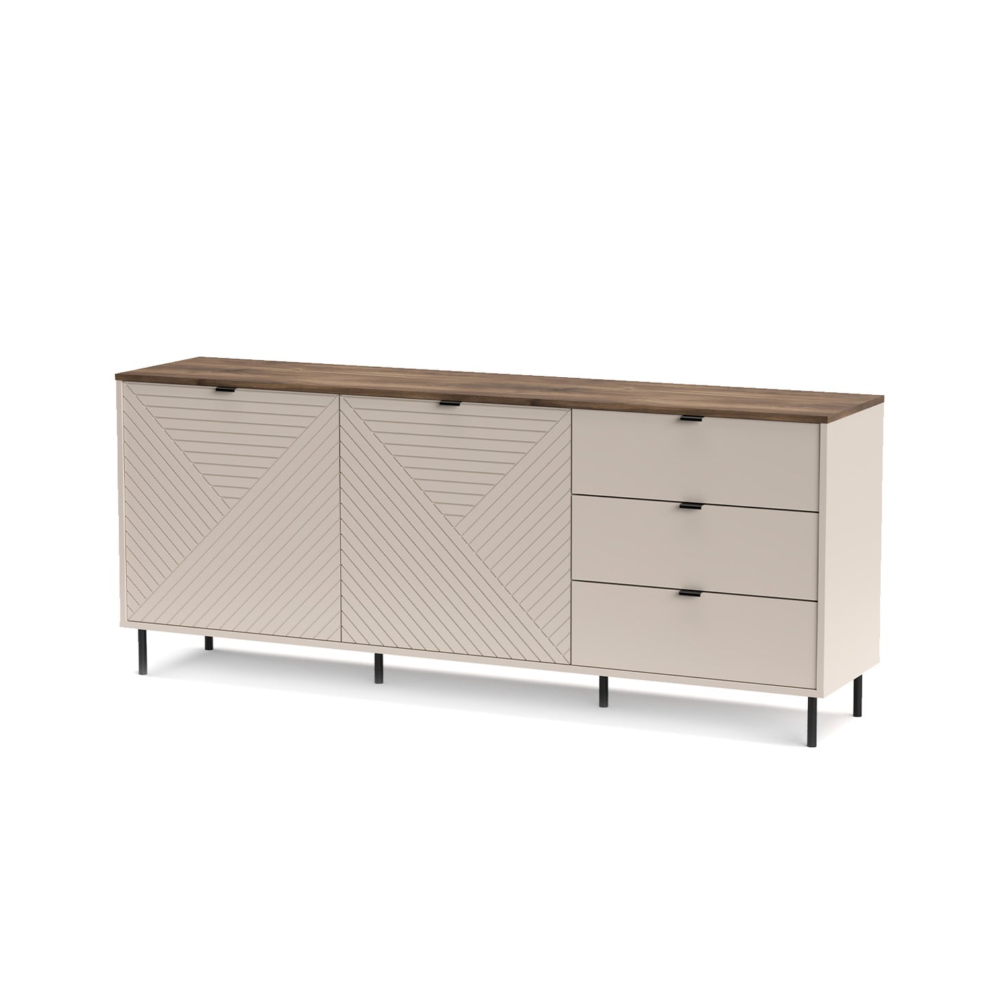 Poznaj komodę Evo z dwiema drzwiami – nowoczesne połączenie elegancji i funkcjonalności. Wykończona w stylowej kolorystyce cashmere i dębu Castello, wprowadza wyrafinowany charakter do każdego wnętrza. Smukła, nowoczesna sylwetka i dekoracyjne, teksturowane fronty nadają meblowi unikalny wygląd.