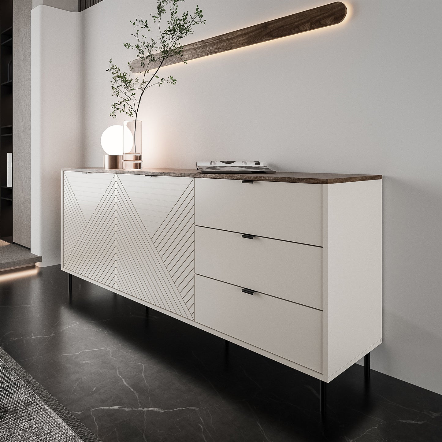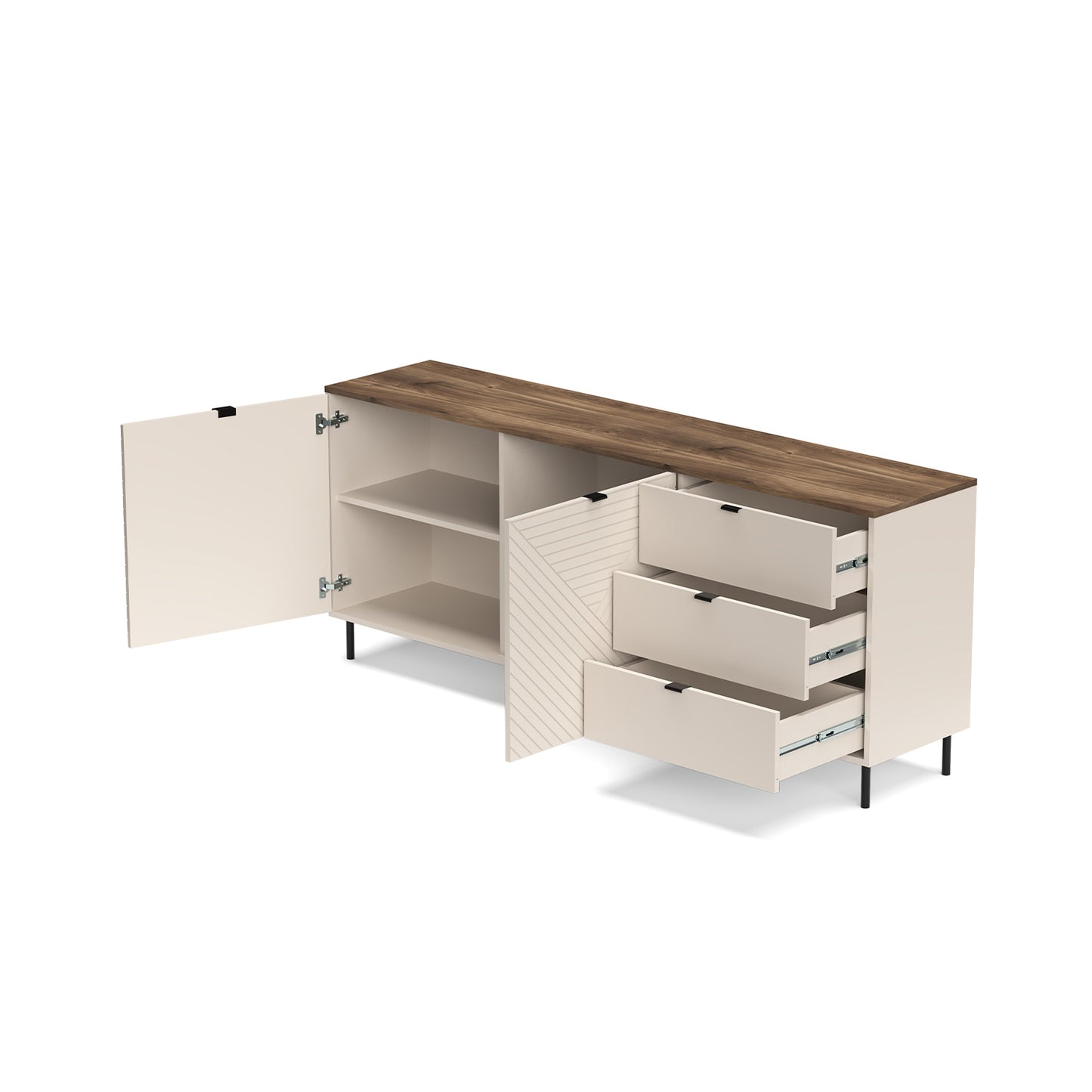 Dzięki przestronnym schowkom Evo zapewnia miejsce na przechowywanie wszystkich niezbędnych rzeczy – bez kompromisów w kwestii estetyki. To idealne rozwiązanie do salonu, jadalni czy przedpokoju, które łączy styl z praktycznością.