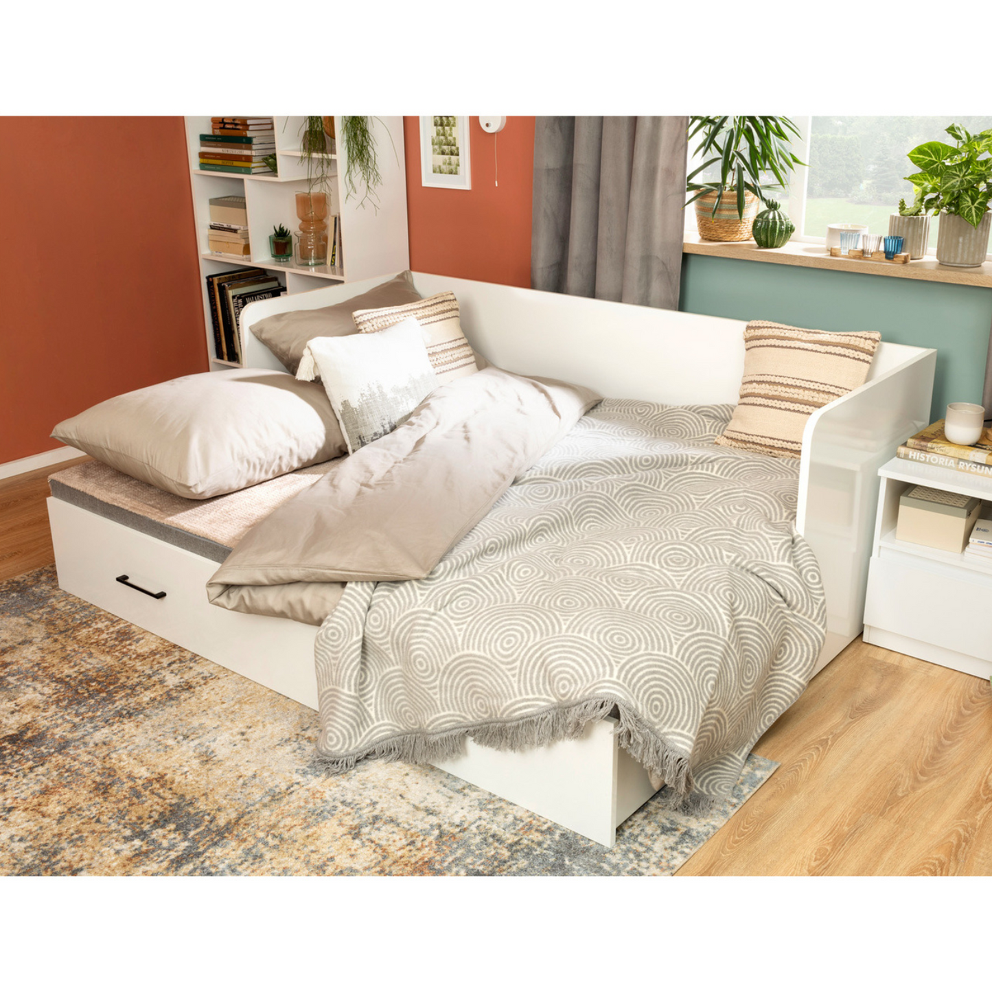 Łóżko składane Exter z pojemnikiem, materacem i poduszkami łączy nowoczesny design z funkcjonalnością. Oferuje przestronną powierzchnię do spania, która po rozłożeniu zapewnia większy komfort, wbudowany schowek na pościel dla wygody oraz wysokiej jakości materac H3, gwarantujący optymalne wsparcie. W komplecie znajdują się także miękkie poduszki, co czyni to łóżko idealnym wyborem do stylowych, oszczędzających miejsce wnętrz. Doskonałe do pokoi gościnnych, małych mieszkań czy konfiguracji z łóżkiem dziennym, to rozwiązanie łączy estetykę z praktycznością.