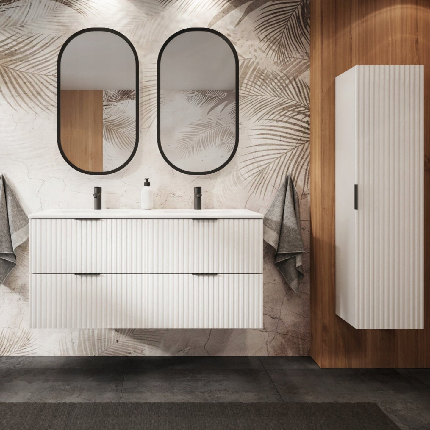 Transform your bathroom into a modern and stylish space with the set of 2 Bathroom Cabinets. This elegant units combines two 60 cm cabinets under a single countertop, featuring trendy grooved MDF fronts, laminated top and board body ensuring durability and resistance to bathroom conditions.
