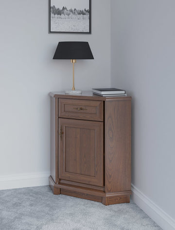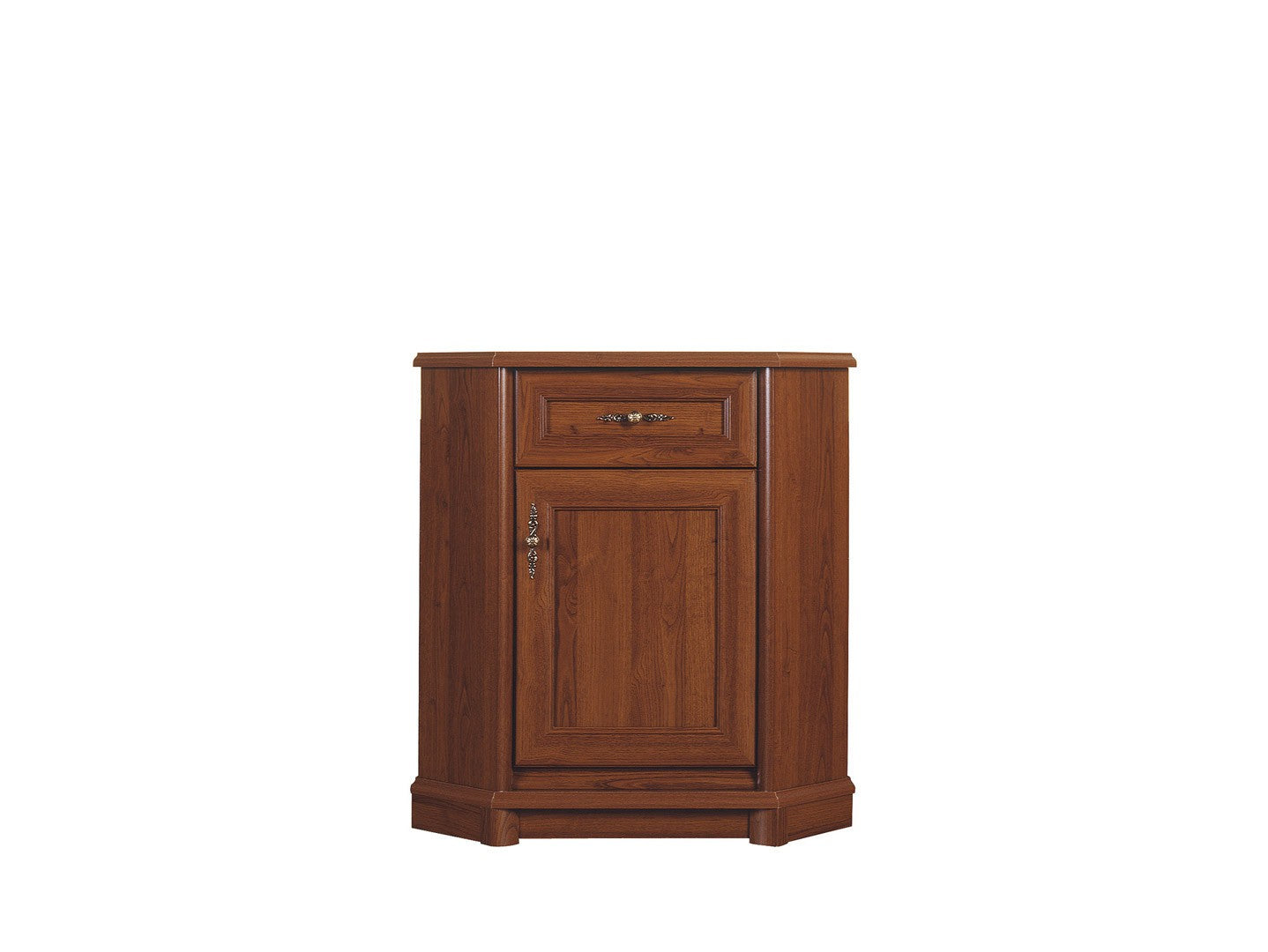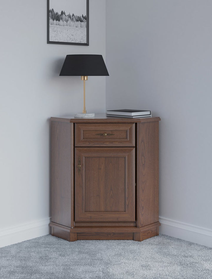 Narożna komoda Kent to elegancki i funkcjonalny mebel, który idealnie sprawdzi się w niewielkich pomieszczeniach. Dzięki konstrukcji przeznaczonej do trudnych do zagospodarowania kątów, oferuje wewnętrzną półkę oraz praktyczną szufladę na niezbędne akcesoria. Okleina odwzorowująca strukturę surowego drewna w połączeniu z ciepłym wybarwieniem kasztan dodaje uroku i klasy.