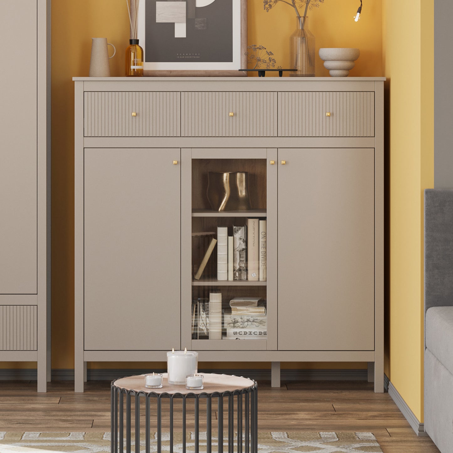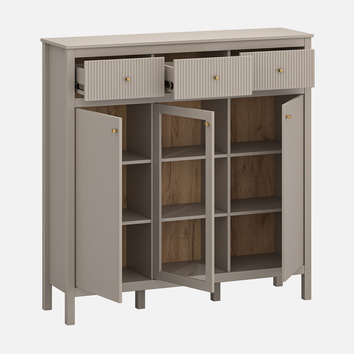 Komoda Kleo łączy styl z funkcjonalnością dzięki trzem drzwiom, jednej przeszklonej witrynie i trzem szufladom. Wykończona w eleganckim odcieniu taupe, wnosi nowoczesny, a zarazem neutralny charakter do jadalni lub salonu, zapewniając praktyczne i stylowe miejsce do przechowywania.
