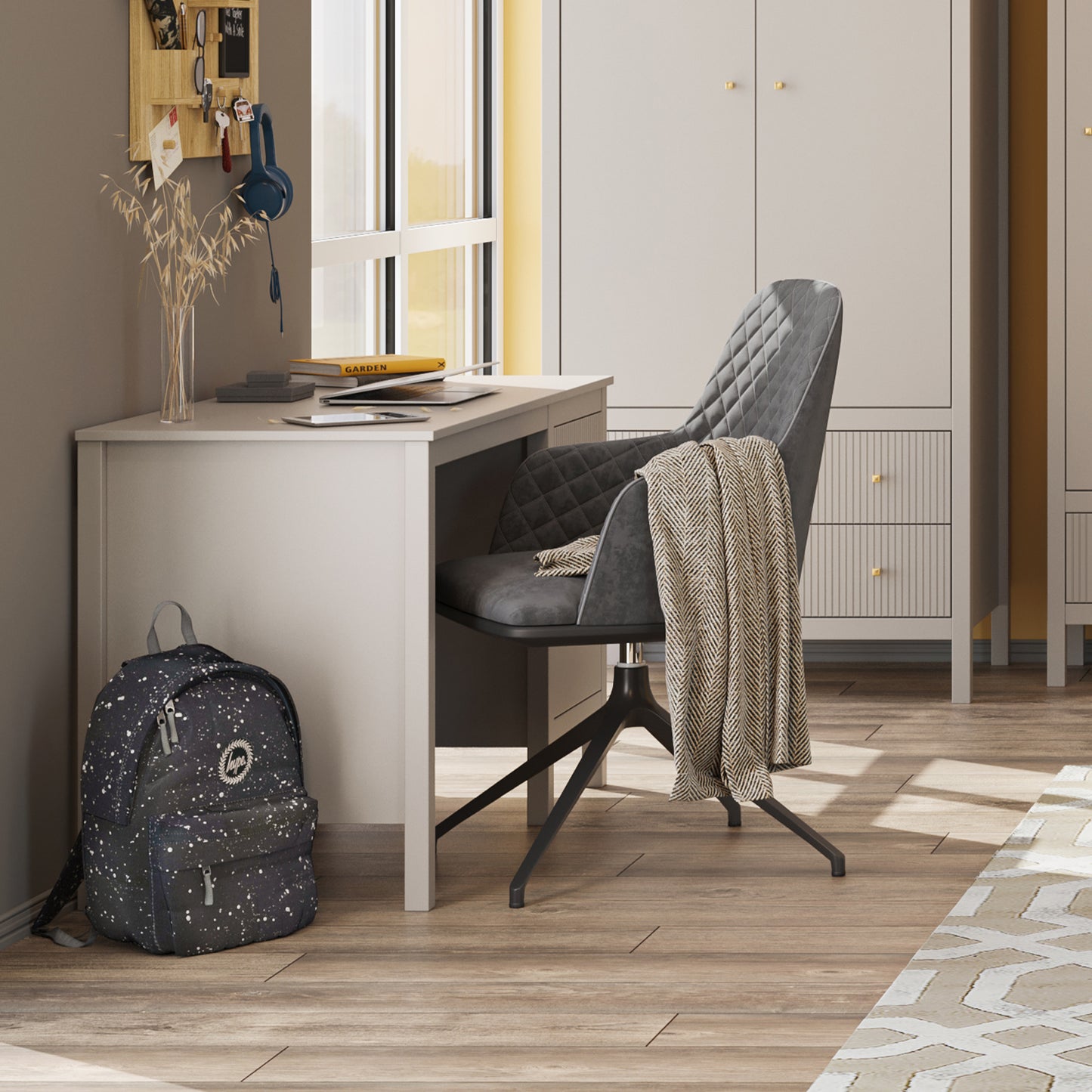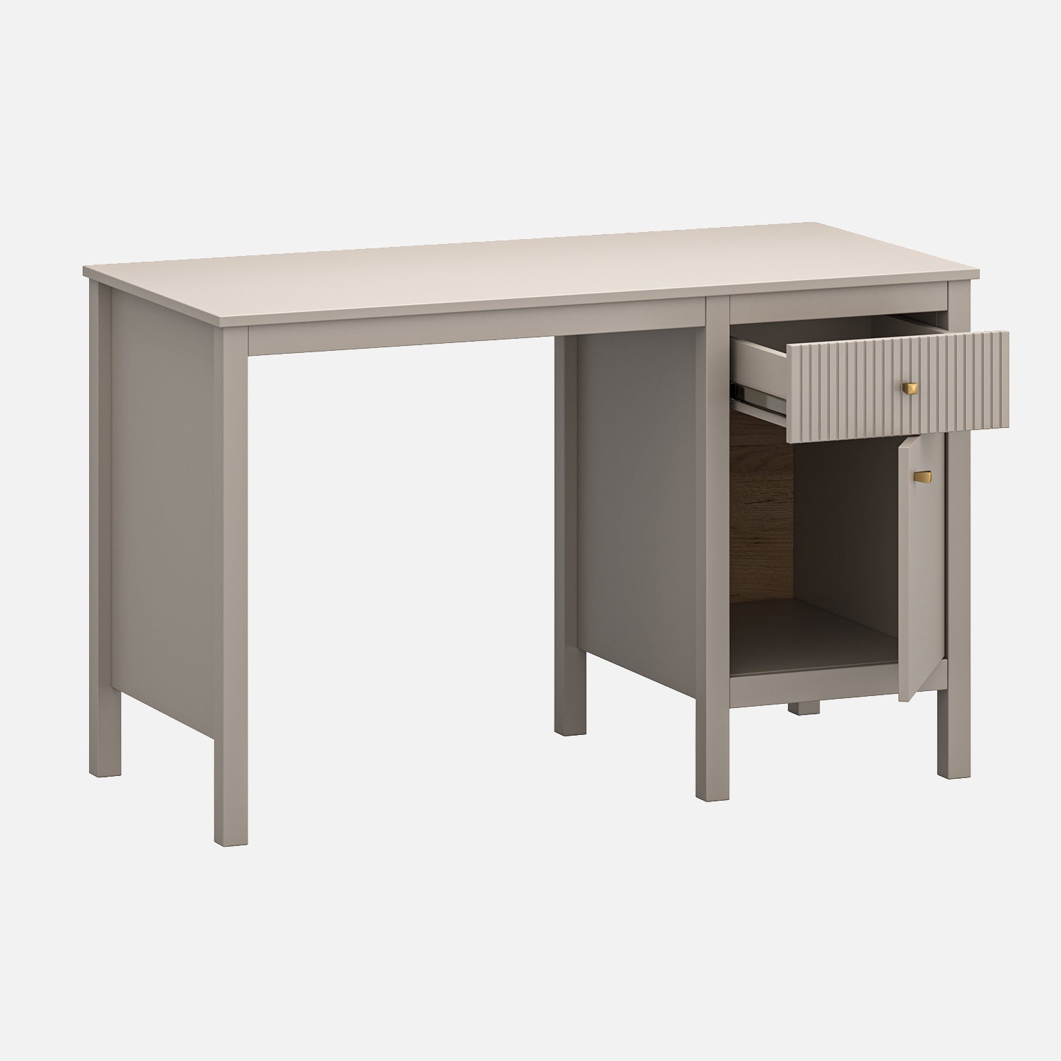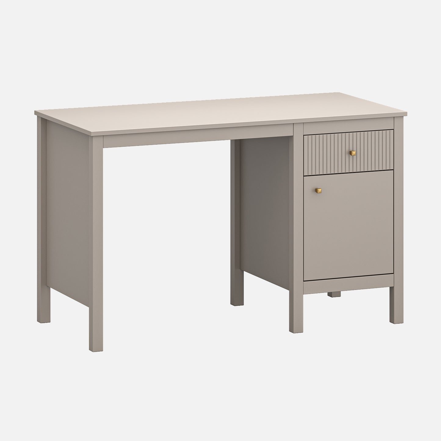 Nowoczesne, minimalistyczne biurko idealne do domowego biura lub strefy nauki. Biurko Kleo w kolorze taupe oferuje szufladę i szafkę, łącząc styl i funkcjonalność, by zapewnić uporządkowaną przestrzeń do pracy.