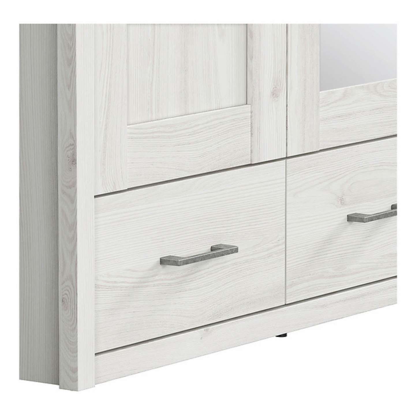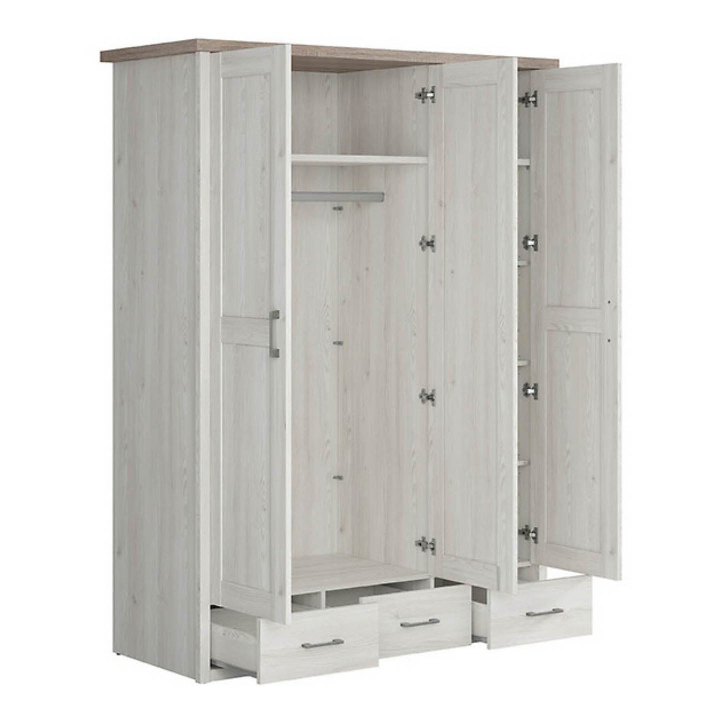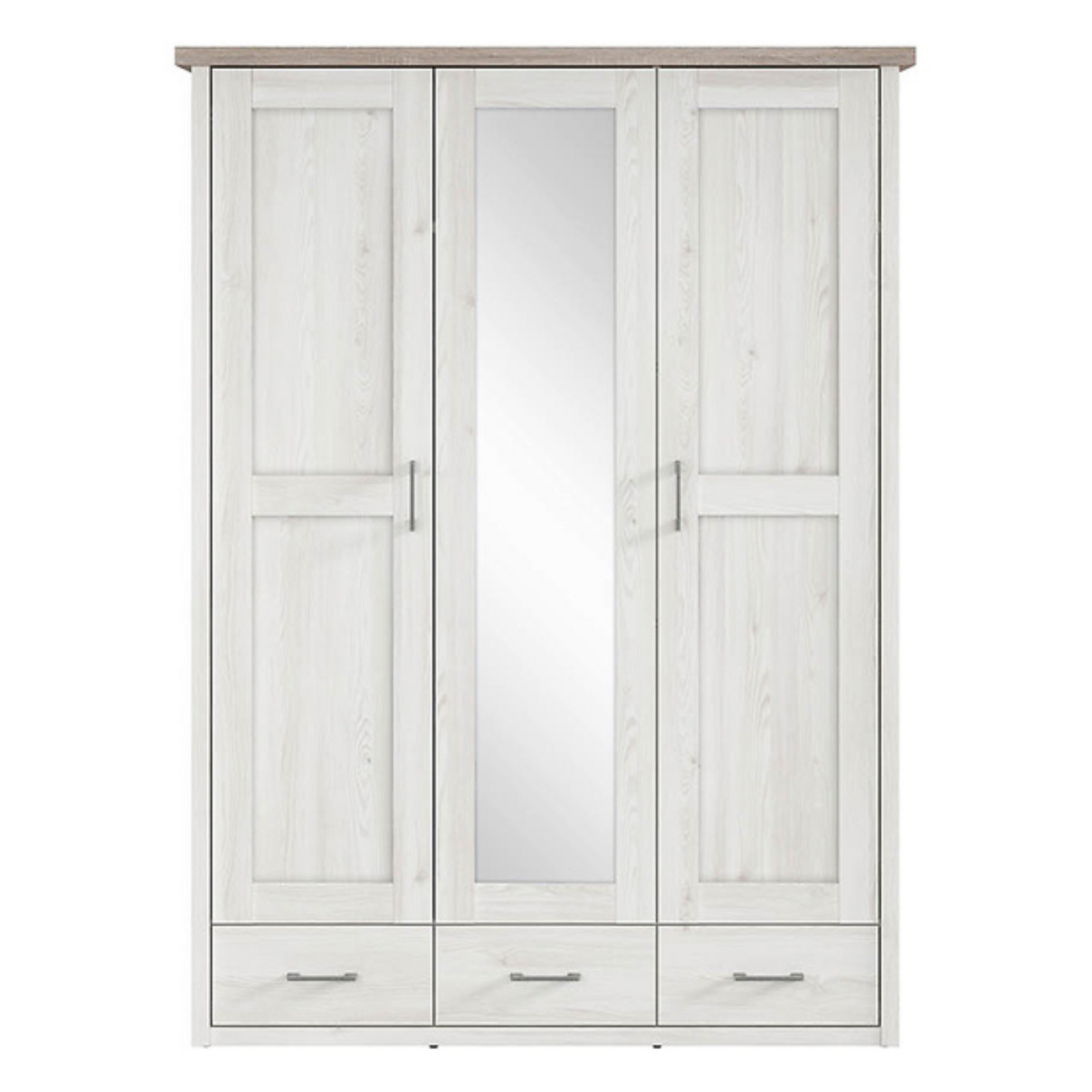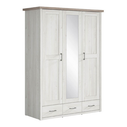 Szafa trzydrzwiowa Loca z lustrem i szufladami to elegancki i funkcjonalny wybór dla osób poszukujących praktycznego przechowywania z nutą prowansalskiego uroku. Zaprojektowana z lustrzanym frontem i przestronnym wnętrzem, łączy atrakcyjny wygląd z codzienną użytecznością. To idealne rozwiązanie dla tych, którzy cenią połączenie klasycznej estetyki z wielofunkcyjnym designem – doskonała propozycja szczególnie do mniejszych sypialni.