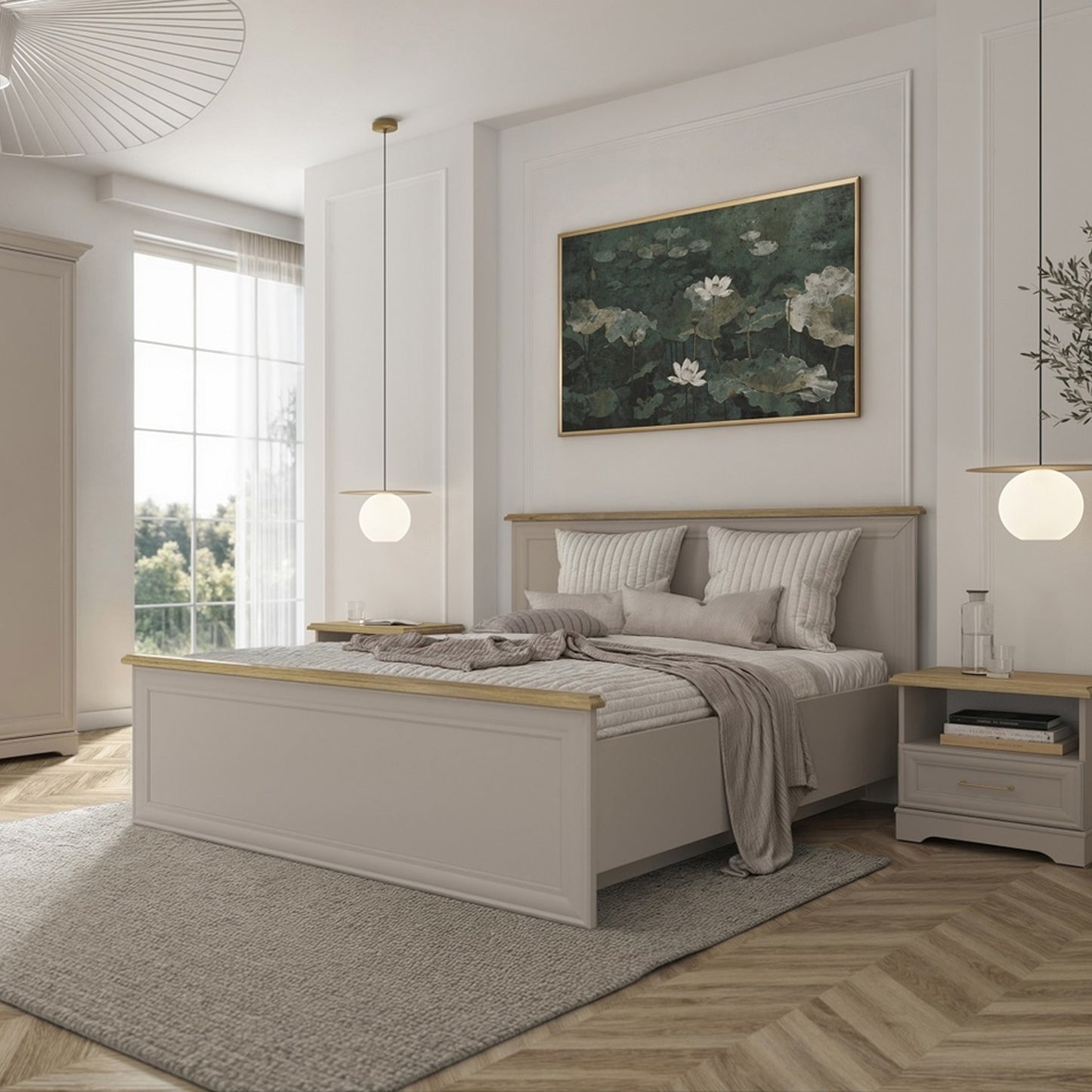 Łóżko naga A 160x200 cm to idealne połączenie wygody i nowoczesnego stylu. Ciepła kolorystyka kaszmir i Dąb Mauvella wprowadza do wnętrza spokój i przytulność, a wysoki zagłówek zapewnia komfort podczas odpoczynku. Prosta forma i subtelne detale sprawiają, że mebel świetnie odnajdzie się zarówno w minimalistycznej, jak i klasycznej sypialni. Materac sprzedawany osobno.