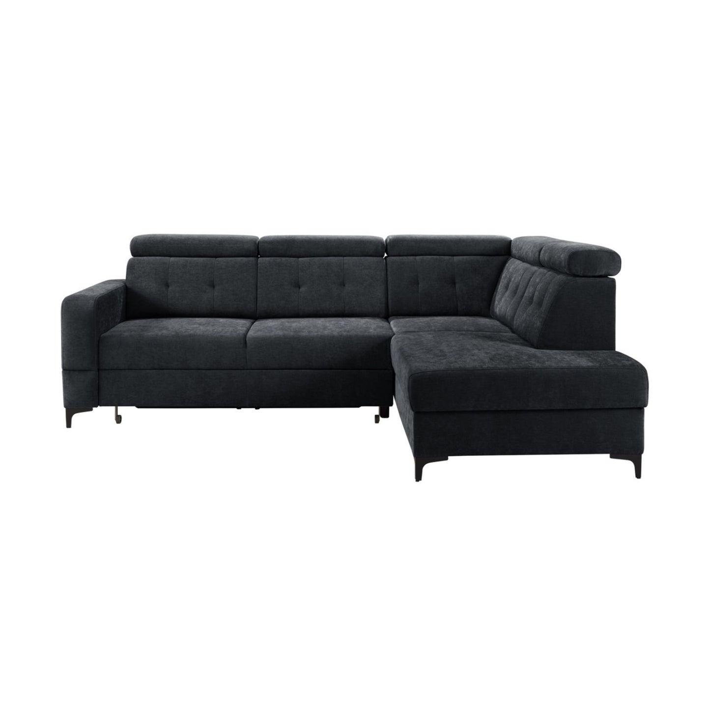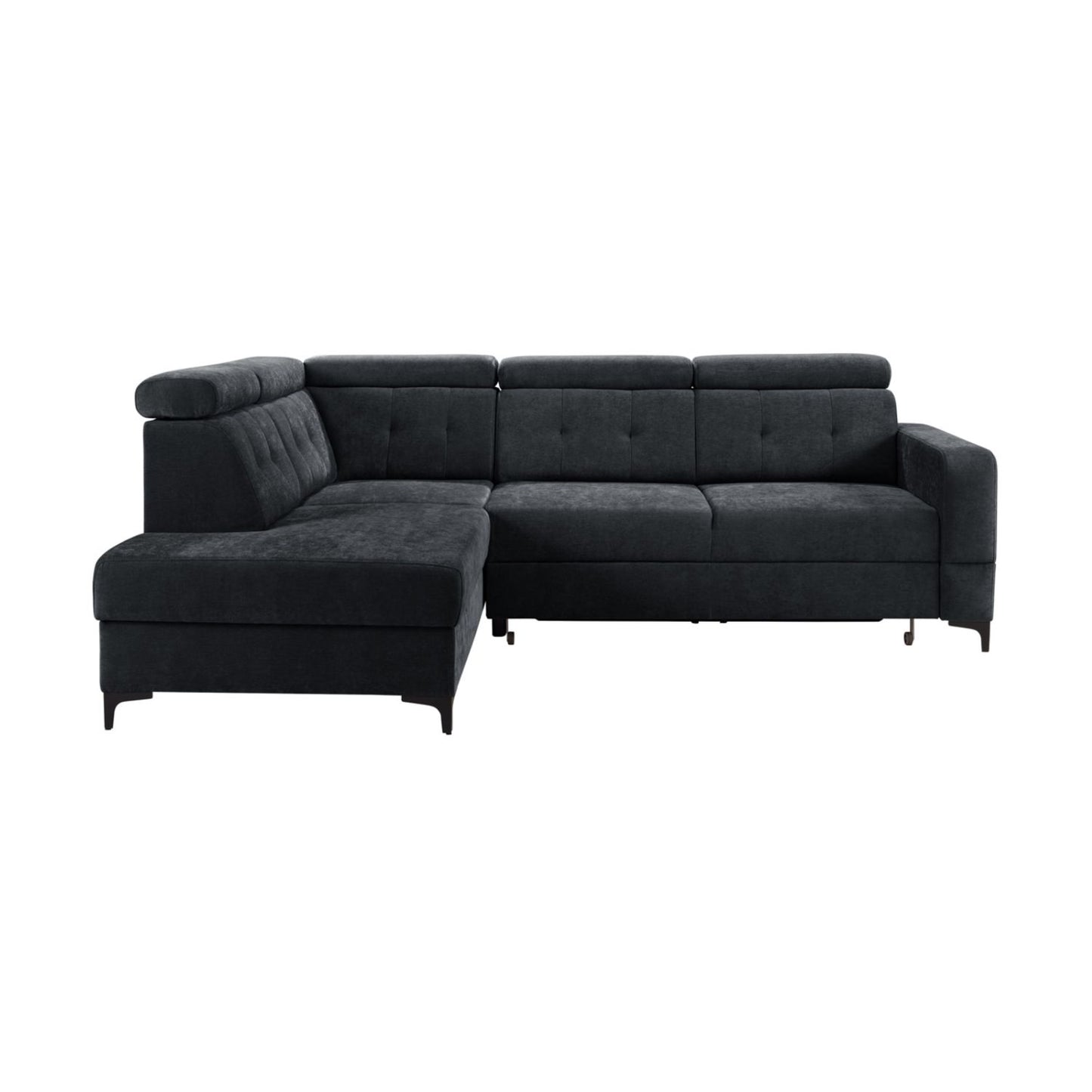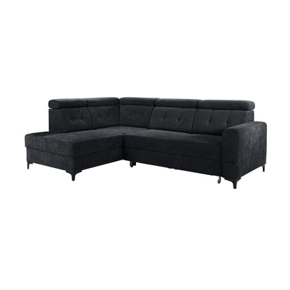 Narożnik przedstawiony na zdjęciu to nowoczesny i funkcjonalny mebel z funkcją spania oraz wbudowanym pojemnikiem na pościel. Doskonale sprawdzi się zarówno do codziennego użytku, jak i do przyjmowania gości na noc. Tapicerowany miękką, przyjemną w dotyku tkaniną, zapewnia wysoki komfort wypoczynku. Regulowane zagłówki, eleganckie przeszycia oraz solidne metalowe nogi nadają mu stylowy i nowoczesny wygląd. Dzięki zintegrowanemu schowkowi łatwo utrzymać porządek w salonie. To idealne połączenie estetyki i funkcjonalności.