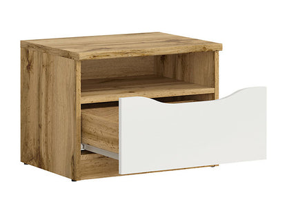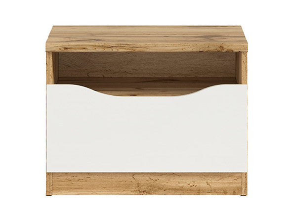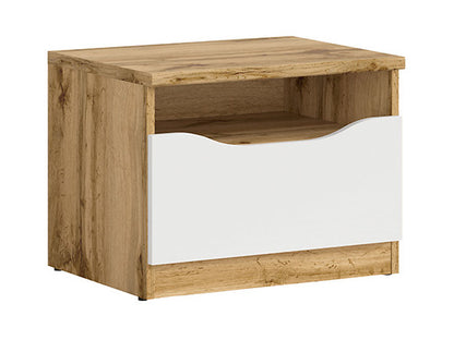 Szafka nocna Nuis to stylowy element nowoczesnej sypialni, łączący naturalne drewno z białym, lakierowanym frontem. Minimalistyczny design i jasna kolorystyka doskonale wpisują się w styl skandynawski. Dzięki otwartej wnęce i zamkniętej części umożliwia zarówno ekspozycję, jak i przechowywanie.