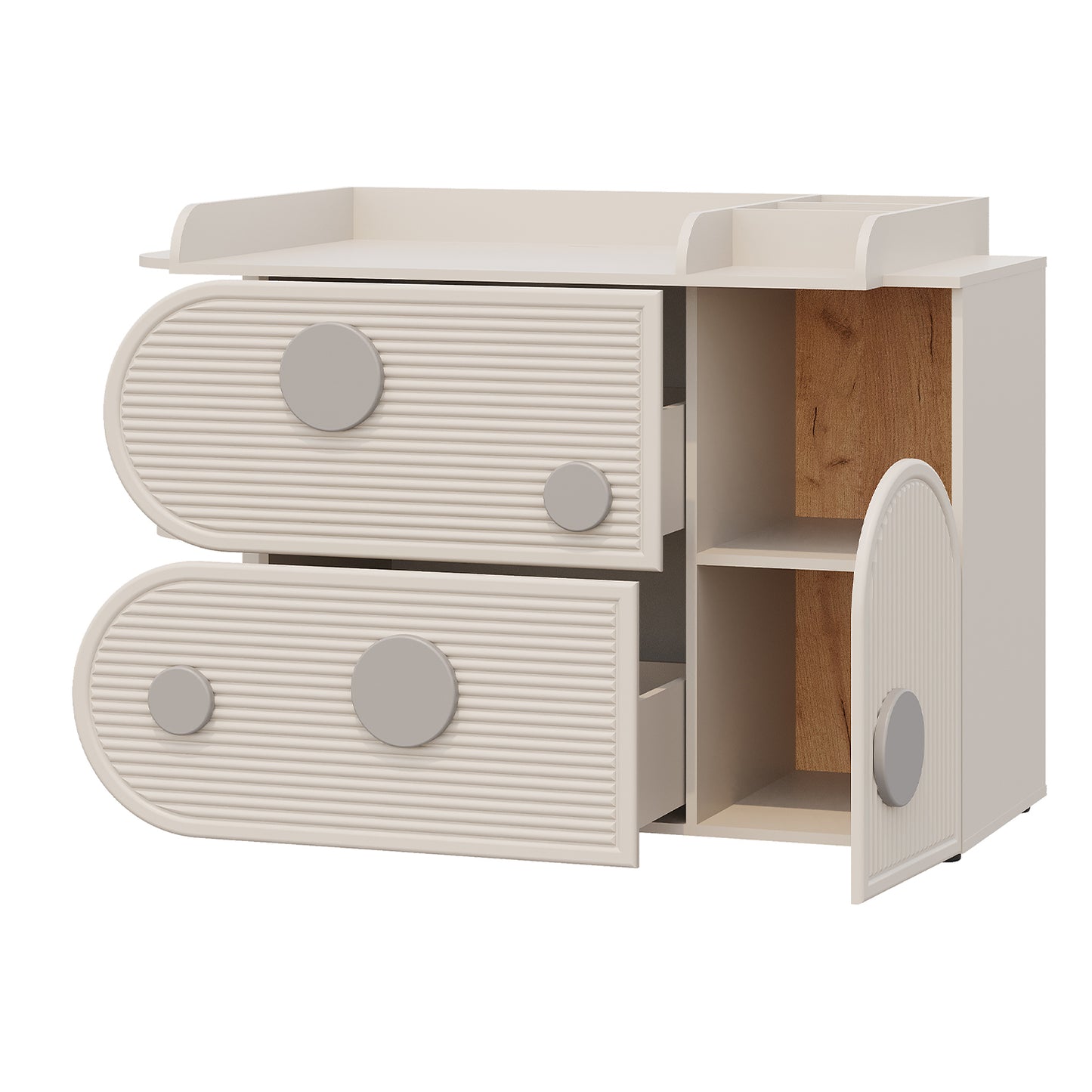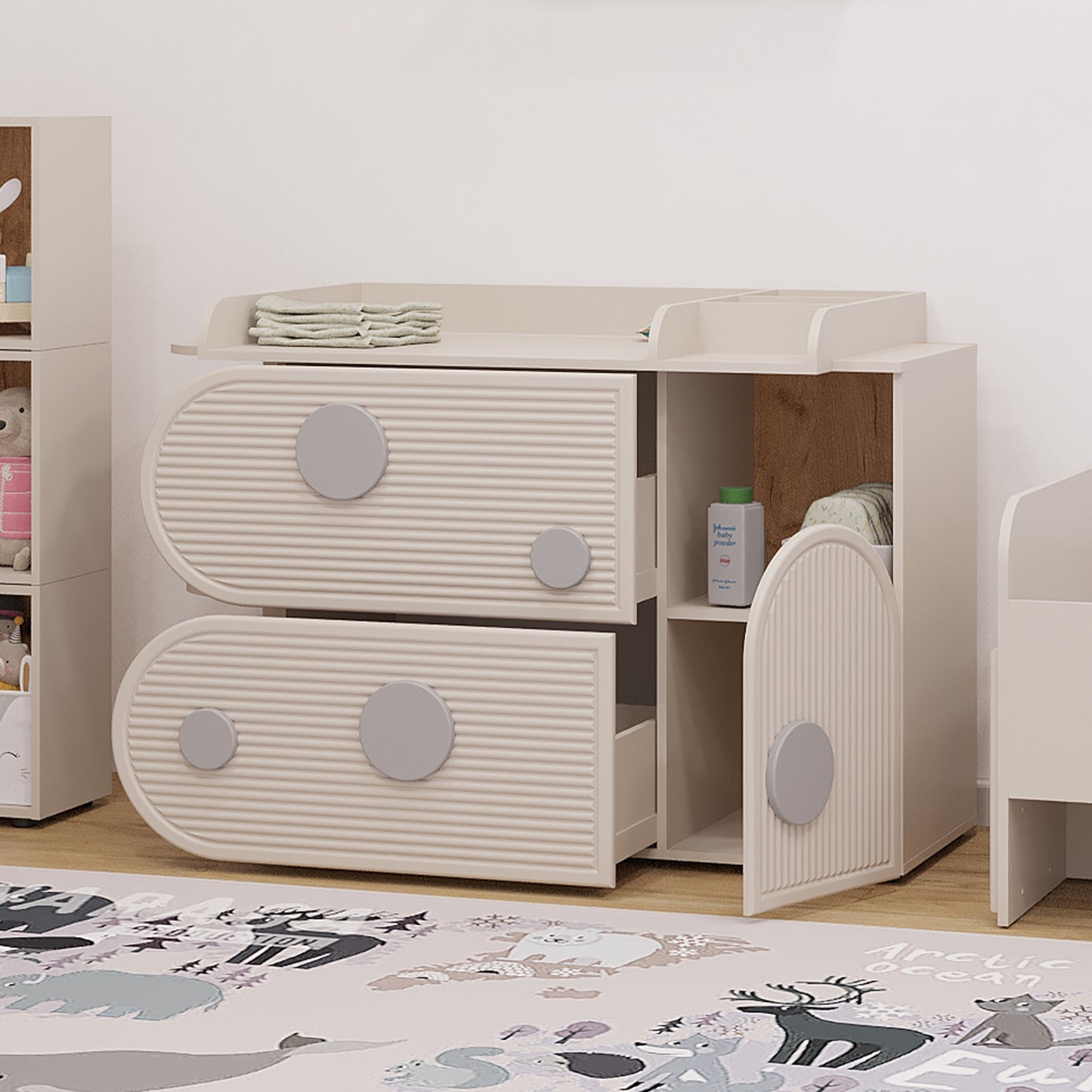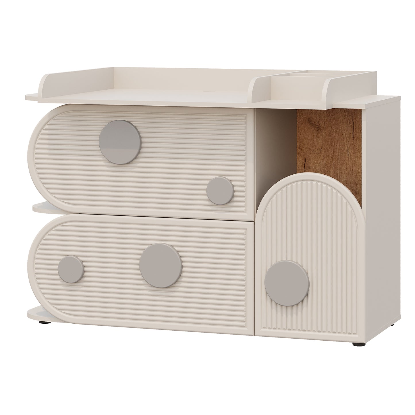 Stworzona z myślą o pokojach dziecięcych i bawialniach, ta komoda wyposażona jest w praktyczny przewijak dla większej wygody. Wykończona w odcieniu kaszmiru, łączy funkcjonalność z uspokajającą estetyką – idealna do przechowywania najpotrzebniejszych rzeczy w zasięgu ręki.
