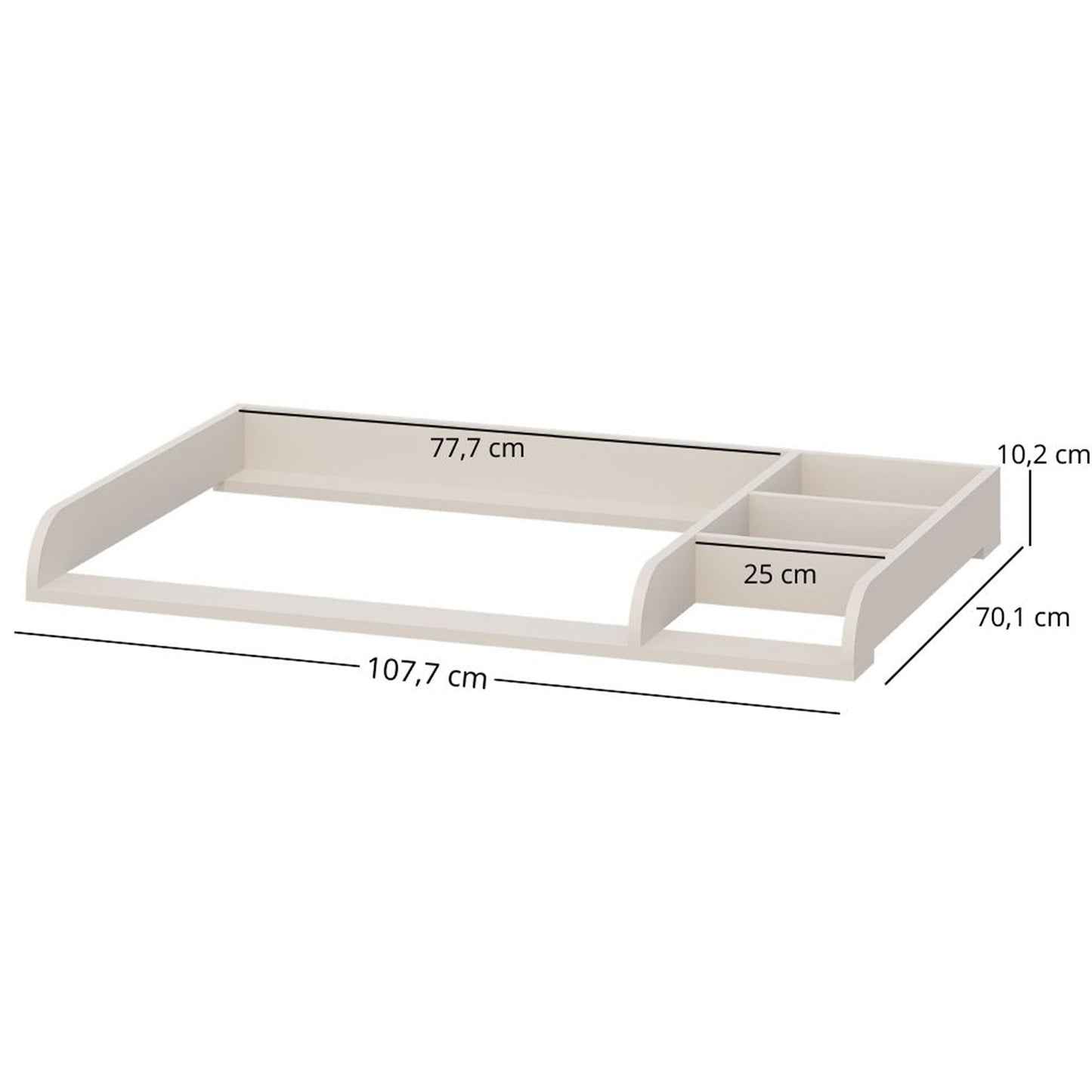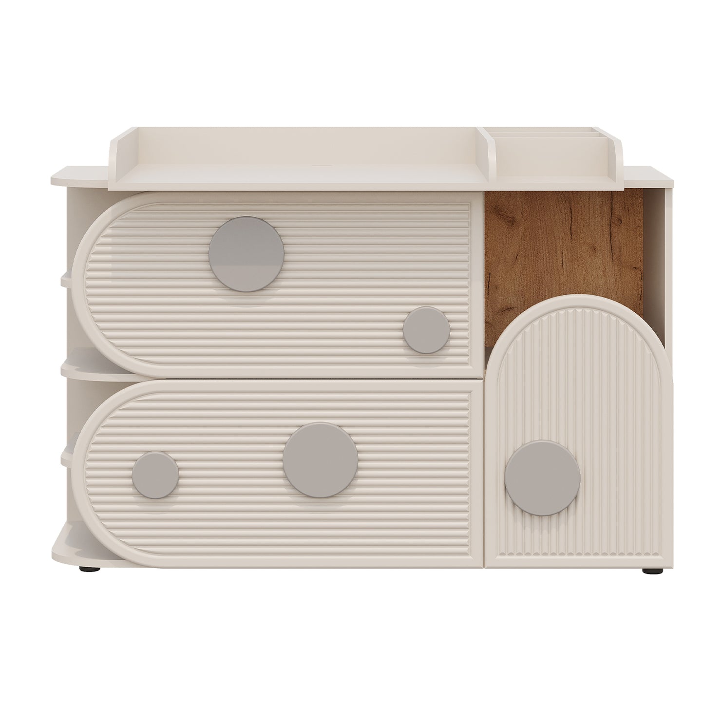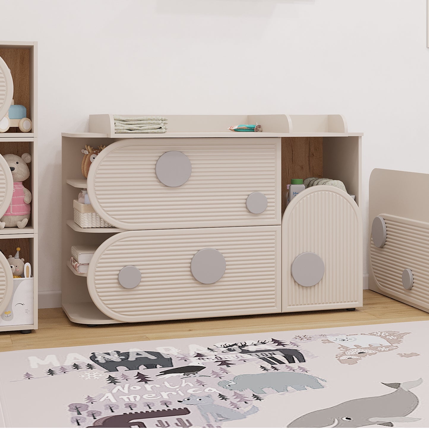 Stworzona z myślą o pokojach dziecięcych i bawialniach, ta komoda wyposażona jest w praktyczny przewijak dla większej wygody. Wykończona w odcieniu kaszmiru, łączy funkcjonalność z uspokajającą estetyką – idealna do przechowywania najpotrzebniejszych rzeczy w zasięgu ręki.