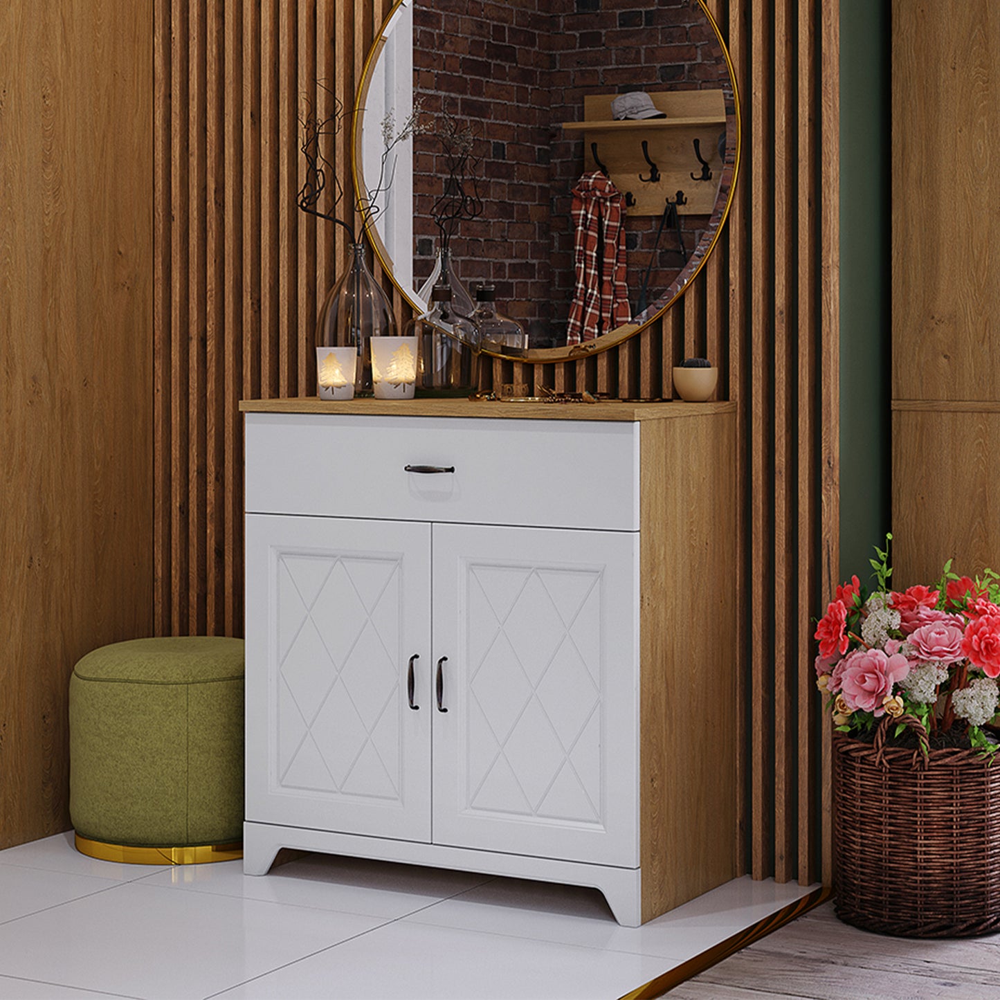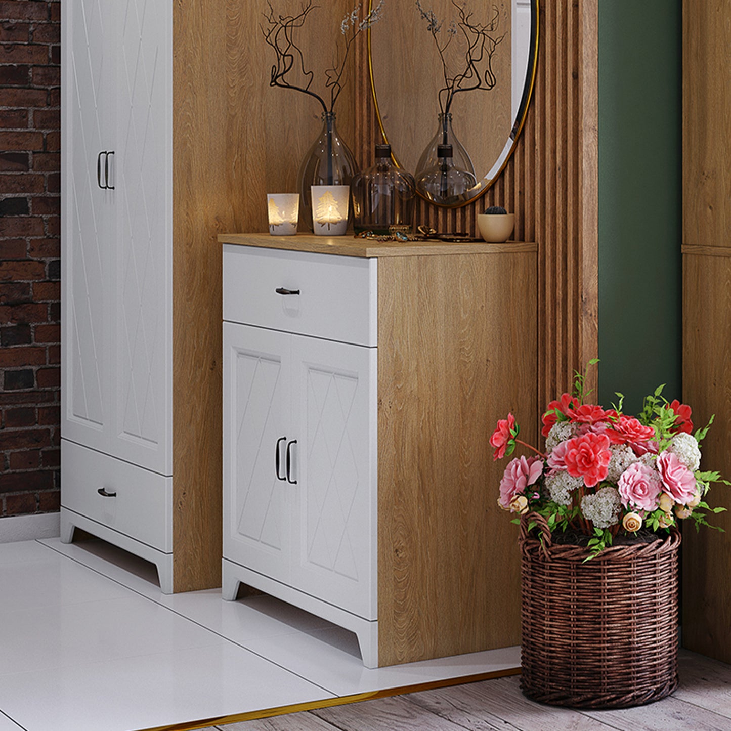 Zachowaj porządek dzięki komodzie Provenza, łączącej dekor dąb kamienny z matową bielą. Wyposażona w dwie szafki i jedną szufladę, oferuje stylowe i praktyczne miejsce do przechowywania – idealne do nowoczesnych wnętrz.