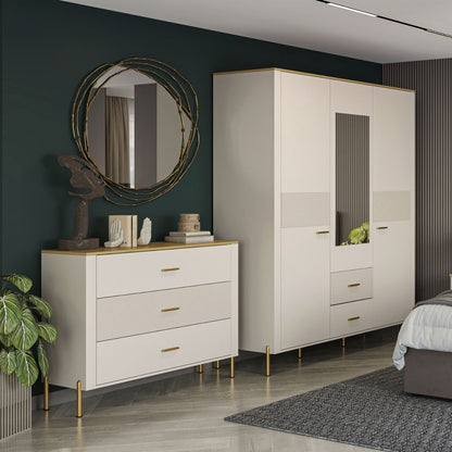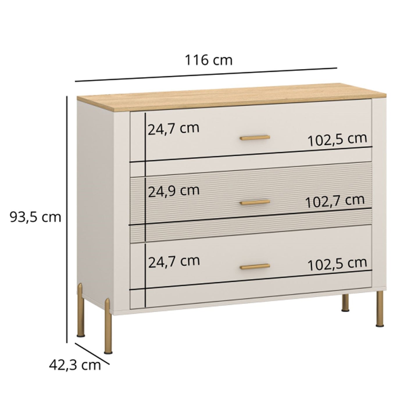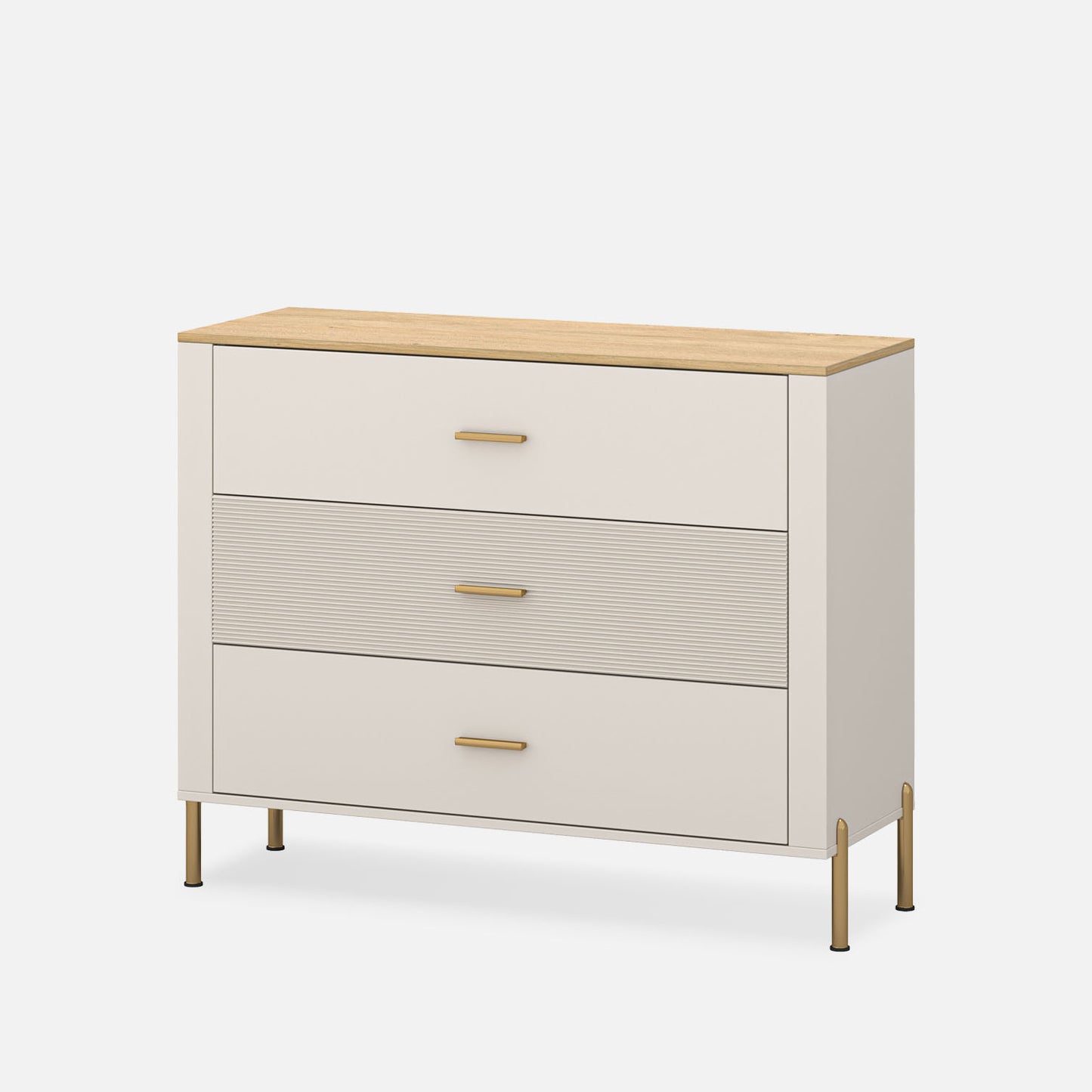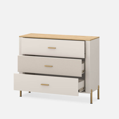 Komoda Ruben oferuje dużo miejsca do przechowywania dzięki trzem pojemnym szufladom, co czyni ją idealnym wyborem do sypialni lub salonu. Stylowe wykończenie w kolorze kaszmiru i dębu kamiennego łączy elegancję z codzienną funkcjonalnością, zapewniając wysmakowane rozwiązanie do utrzymania porządku i świeżości we wnętrzu.