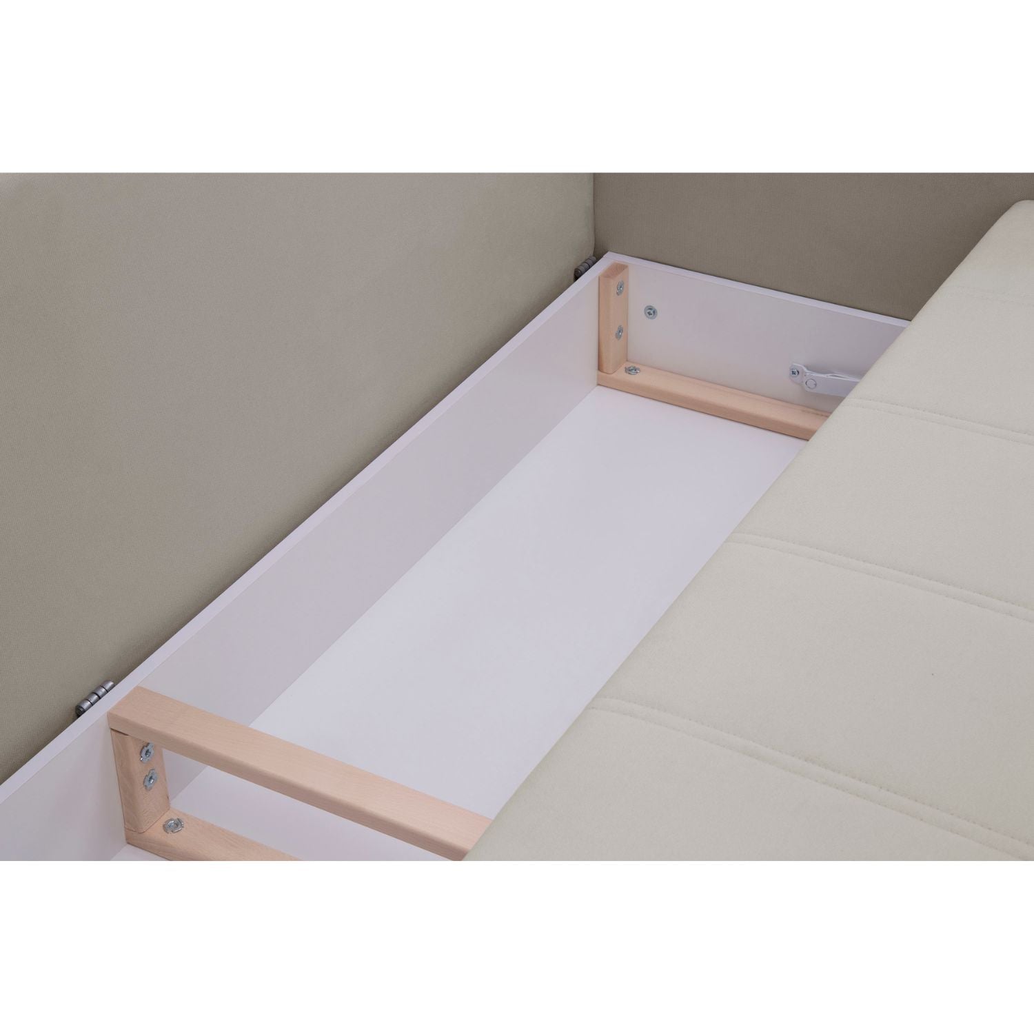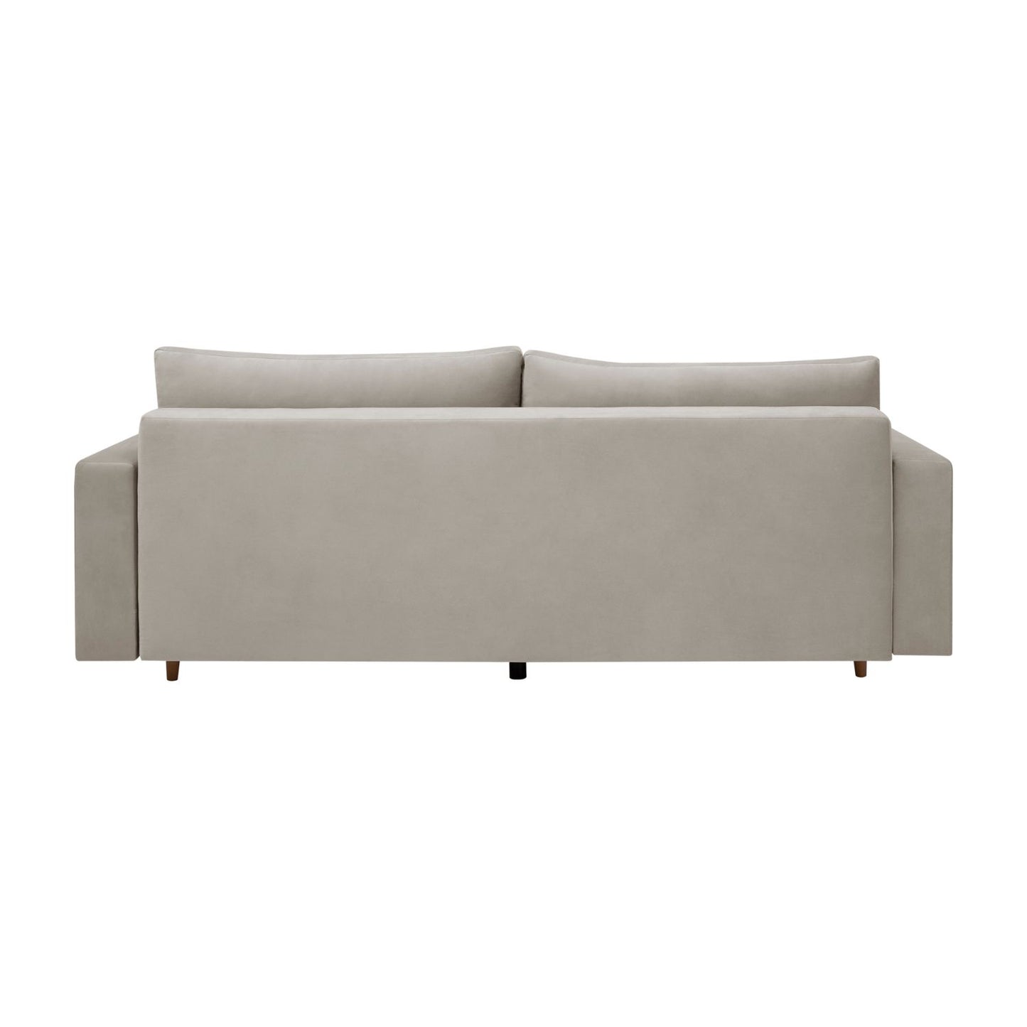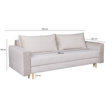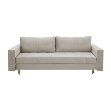 Elegancka i funkcjonalna sofa z funkcją spania oraz pojemnikiem na pościel. Po rozłożeniu zapewnia wygodne miejsce do snu, a schowek pomaga utrzymać porządek. Jej nowoczesny design, czyste linie i drewniane nóżki sprawiają, że doskonale pasuje do różnych stylów wnętrz. Idealna do małego salonu lub jako dodatkowe łóżko dla gości.