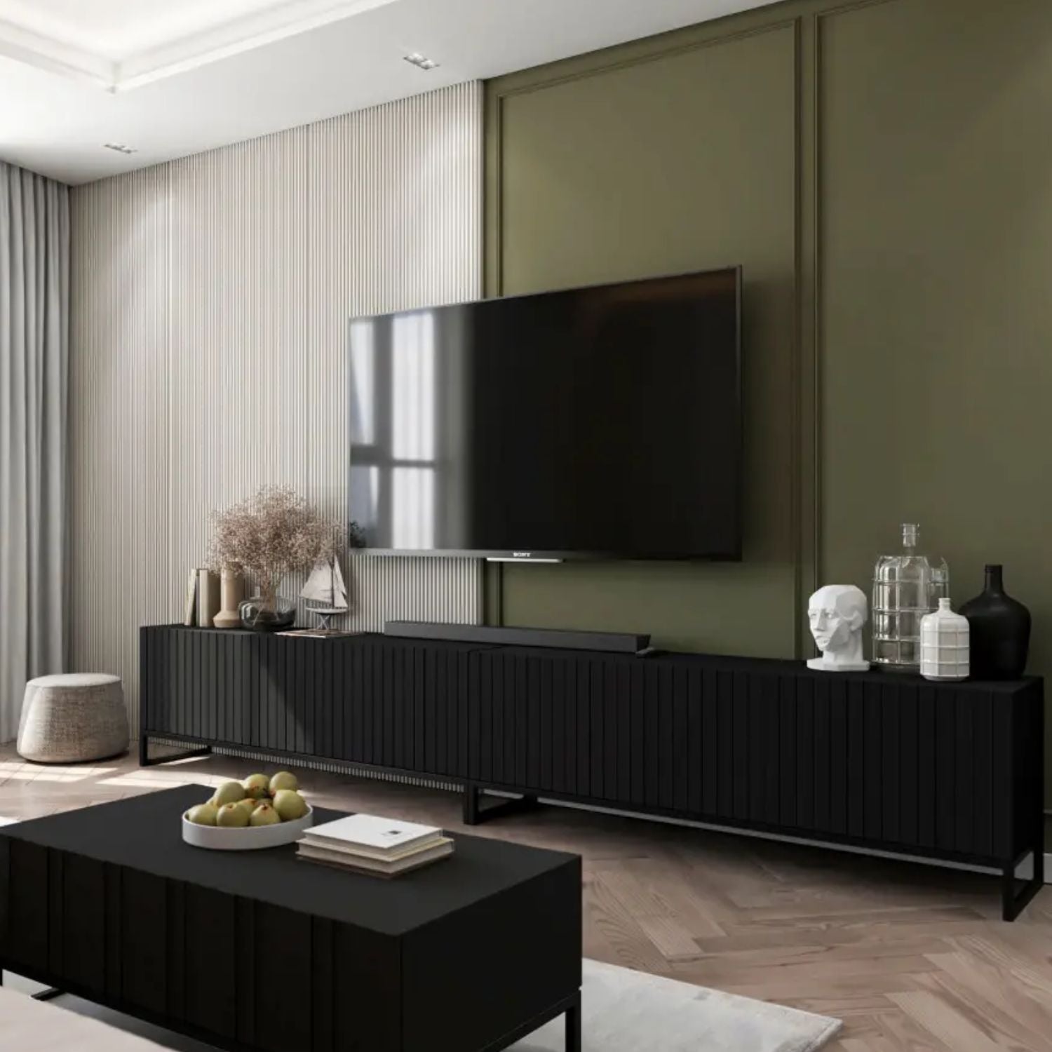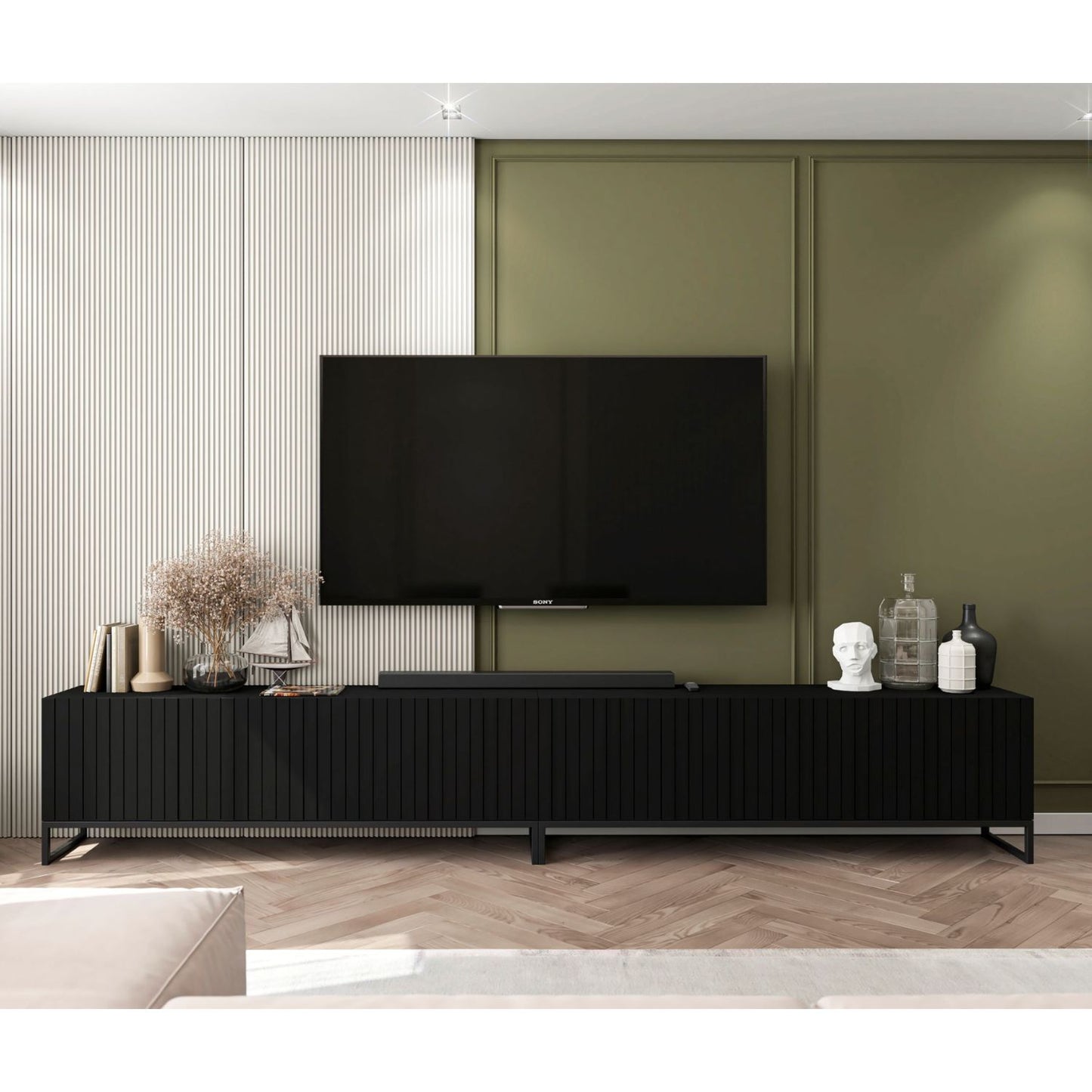 Szafka RTV Elpis Glamour – Ekstra Długa 300 cm – Czarny z Czarną Ramą