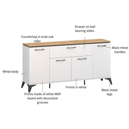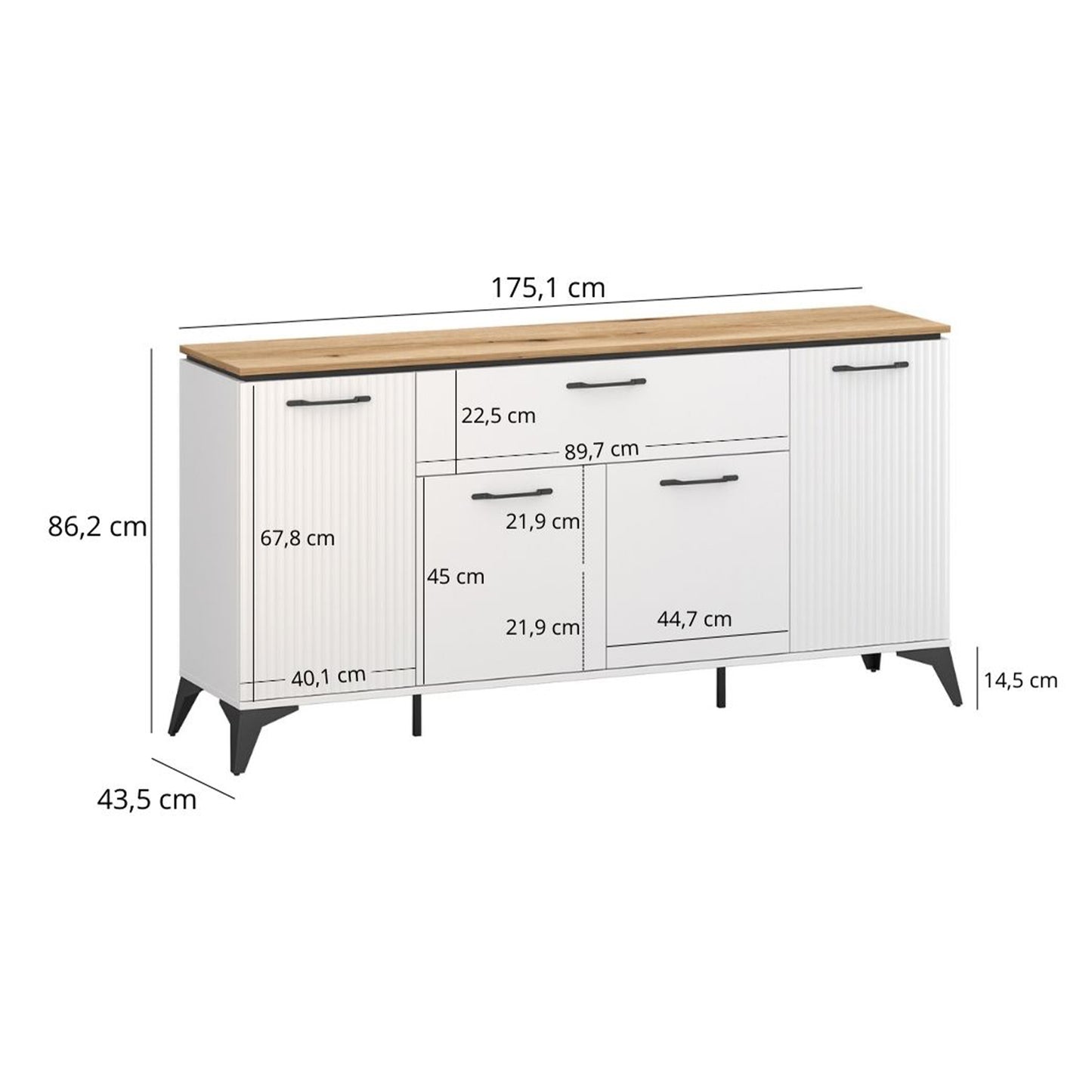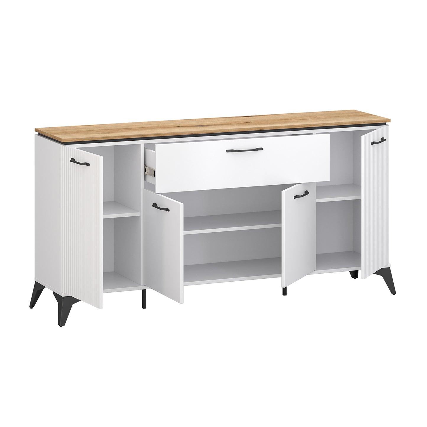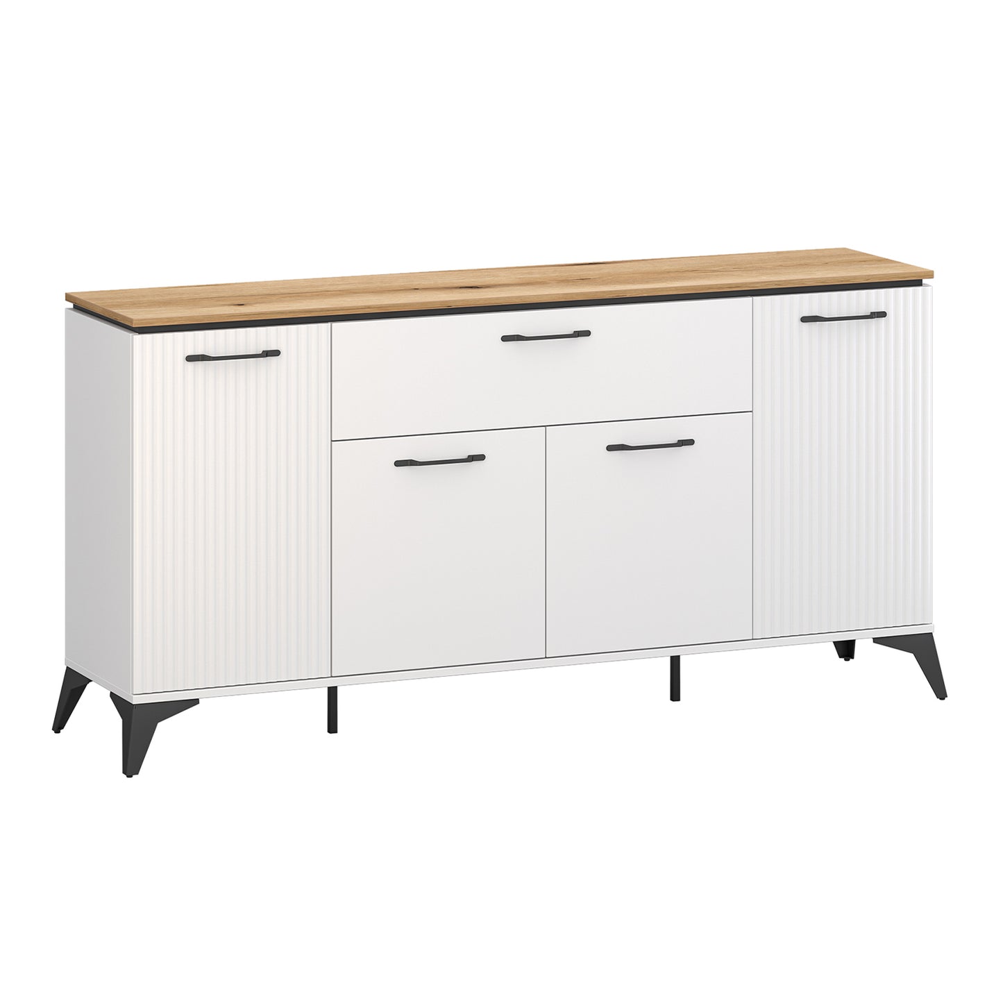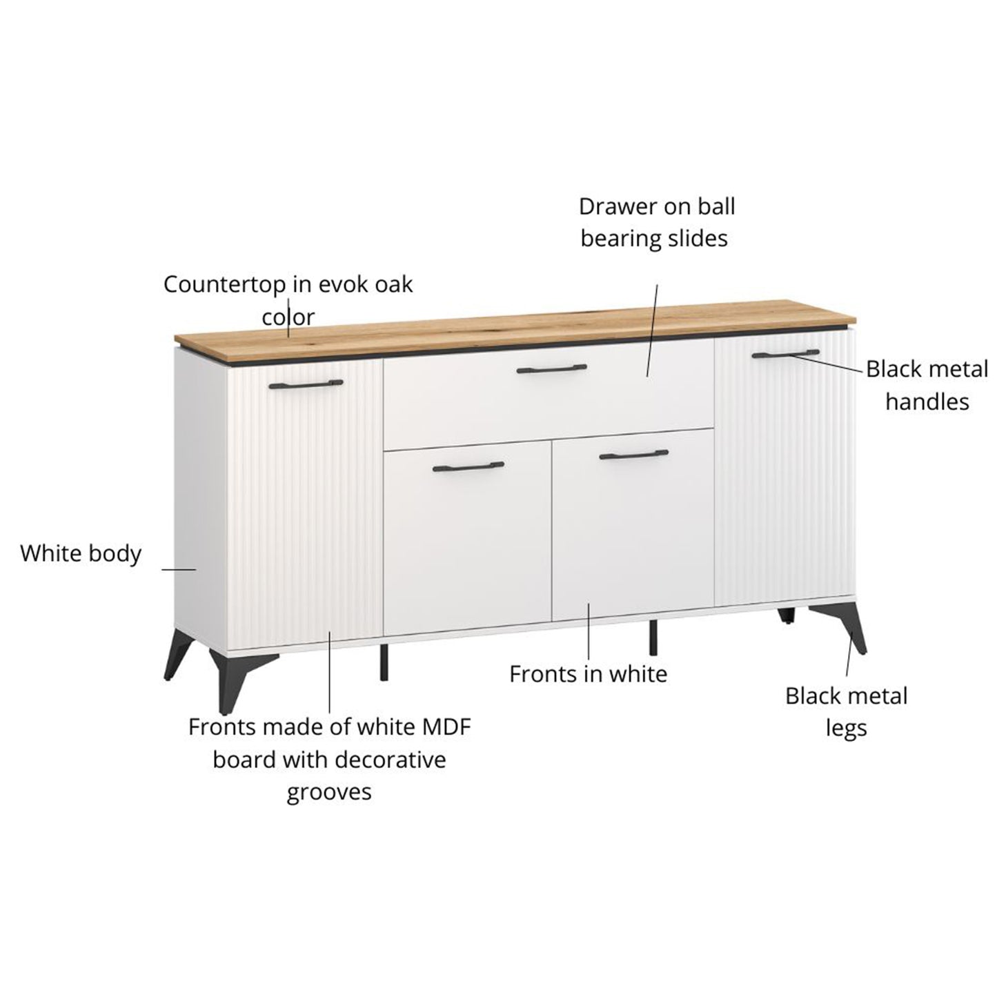 Białe, ryflowane fronty nadają meblowi elegancki i nowoczesny wygląd, który doskonale komponuje się z jasnymi, współczesnymi aranżacjami. Blat z rysunkiem drewna dębu evoke wprowadza ciepło, a czarne metalowe uchwyty i nogi podkreślają nowoczesny, lekko industrialny styl. Komoda będzie świetnym wyborem zarówno do salonu, jak i gabinetu domowego.