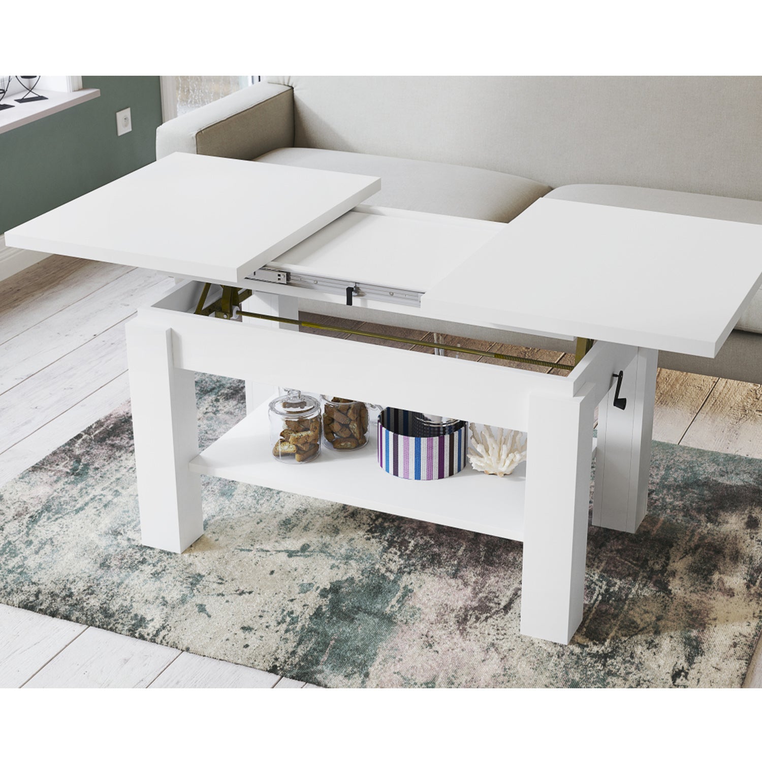 The Extending coffee table Alva is a versatile and stylish addition to any living space. Crafted with exquisite attention to detail, this coffee table seamlessly combines functionality with modern design. Its sleek, minimalist silhouette enhances the aesthetic appeal of your home while providing ample storage and surface space. Featuring a unique extending mechanism, this coffee table effortlessly transforms from a compact size to a larger surface area, adapting to your specific needs. Whether you're hosting a gathering or simply enjoying a cozy evening in, the Alva coffee table ensures convenience and versatility. Constructed from high-quality materials, this coffee table is built to last. Its sturdy frame and durable finish make it resistant to everyday wear and tear, ensuring long-lasting performance. The Alva coffee table is designed to withstand the demands of daily use, making it an ideal investment for your home.