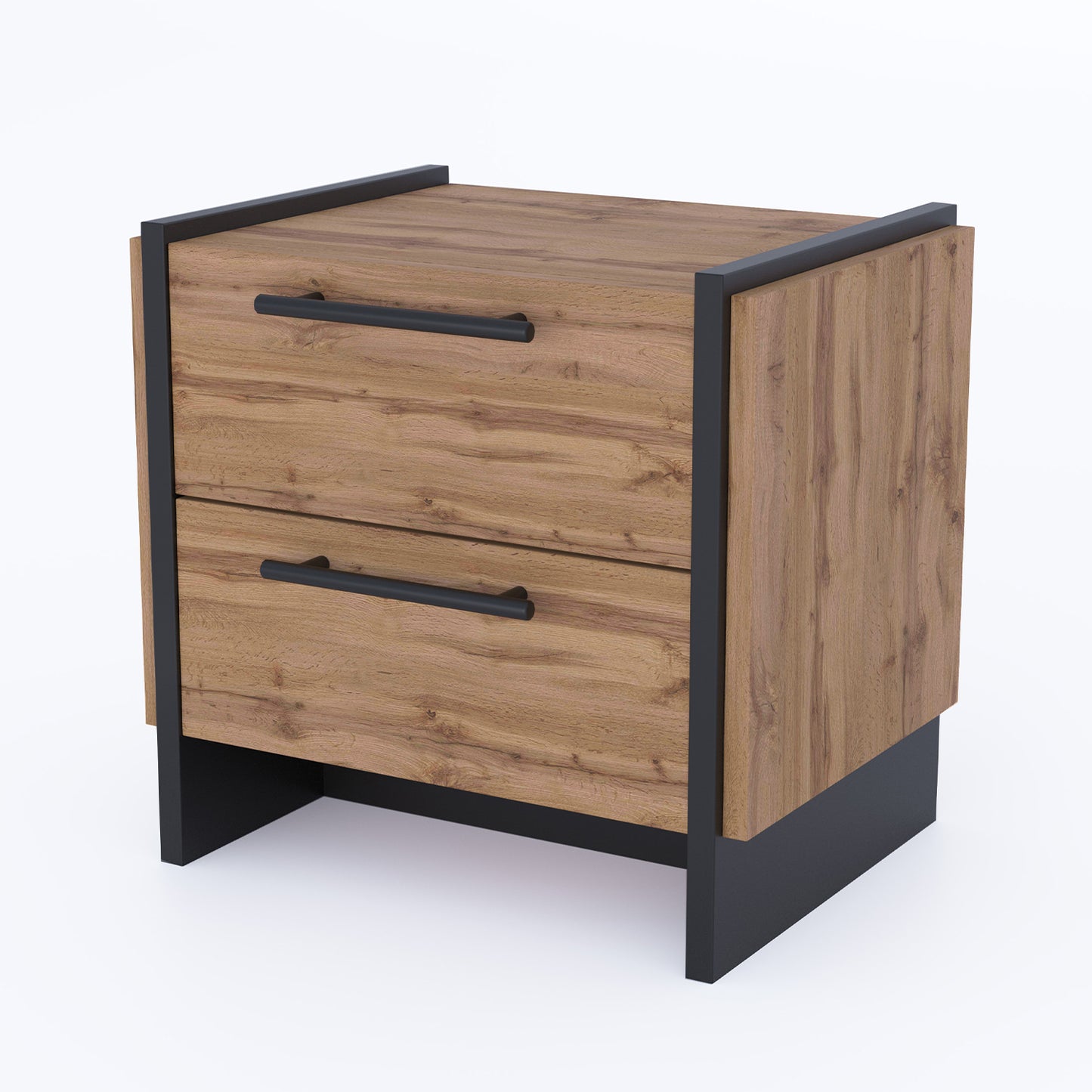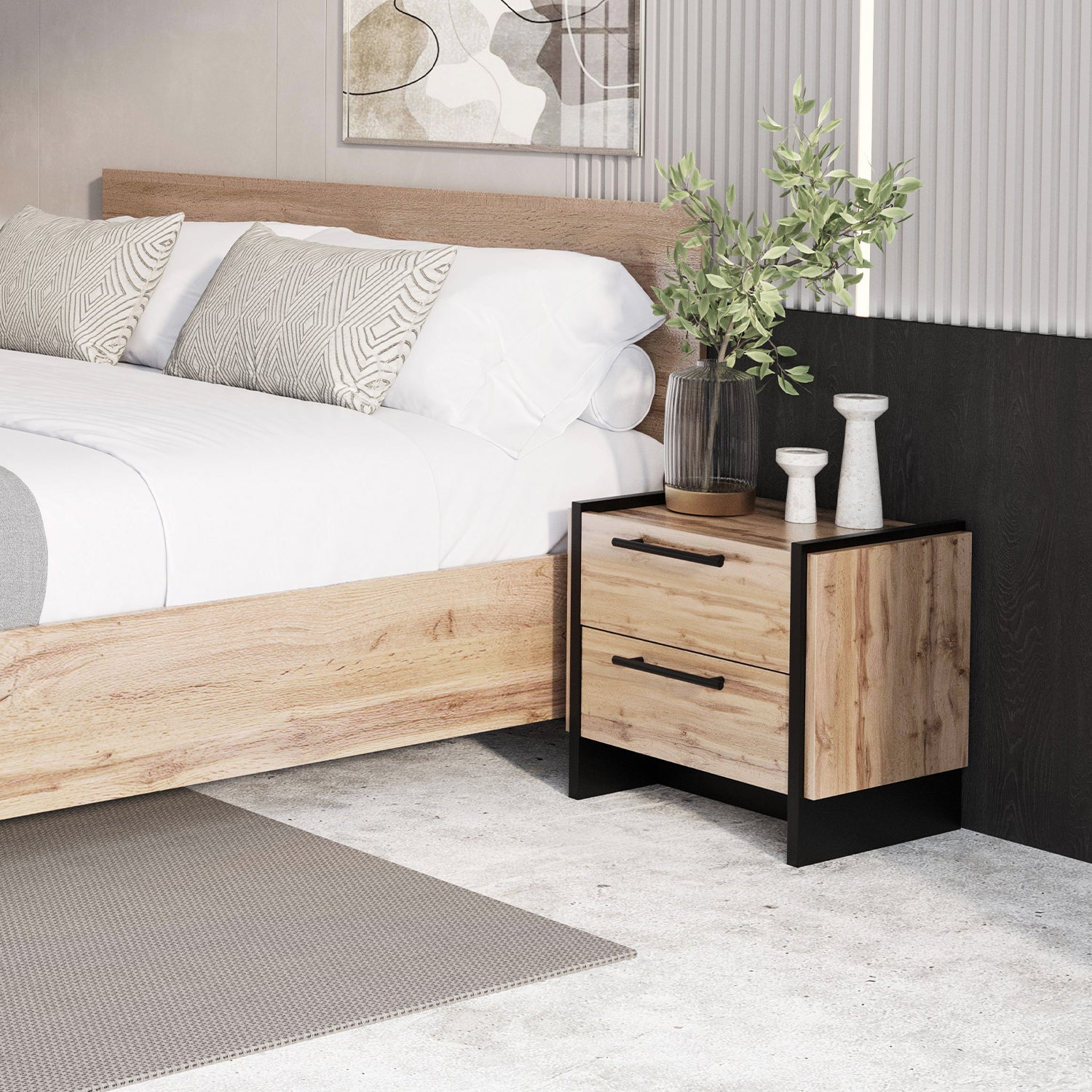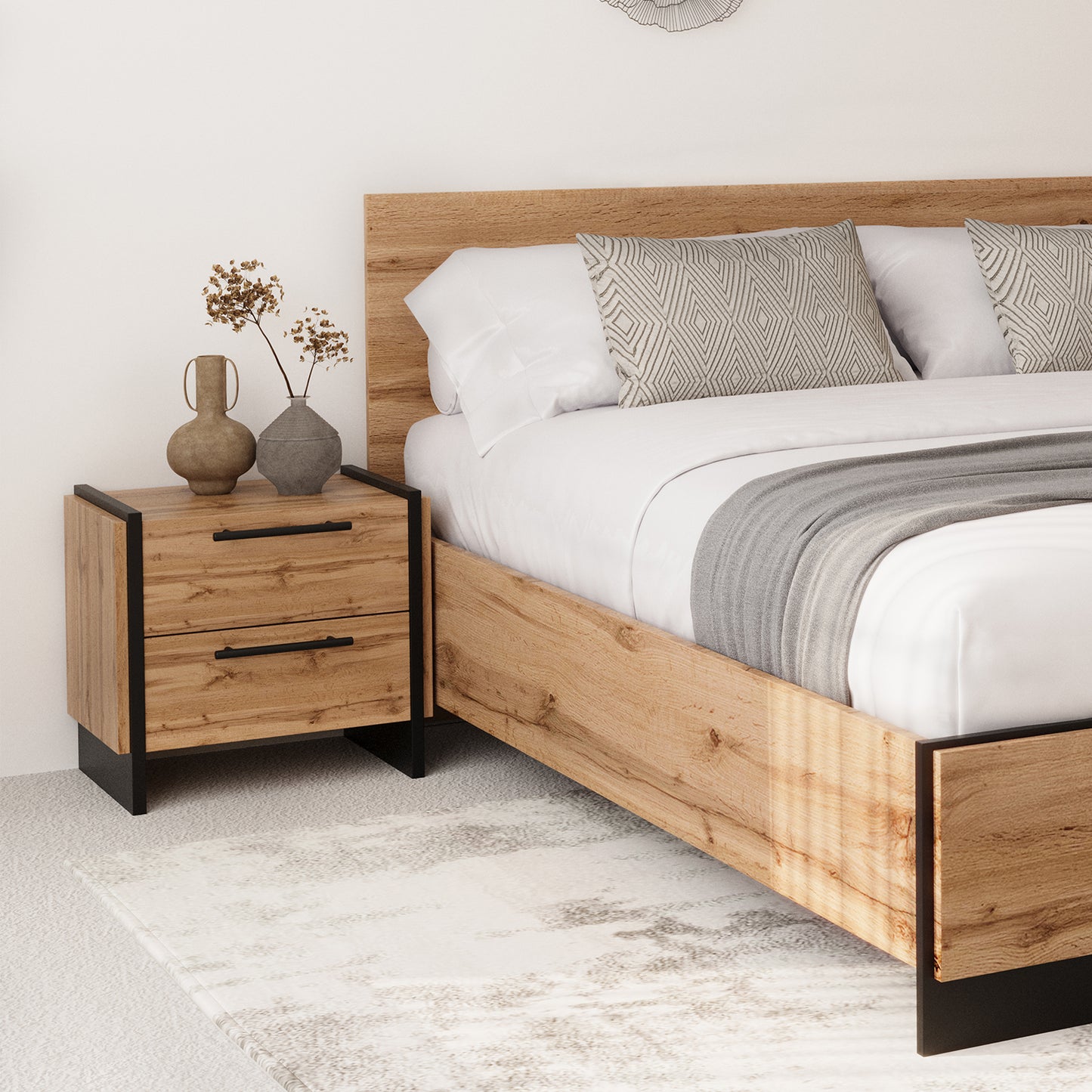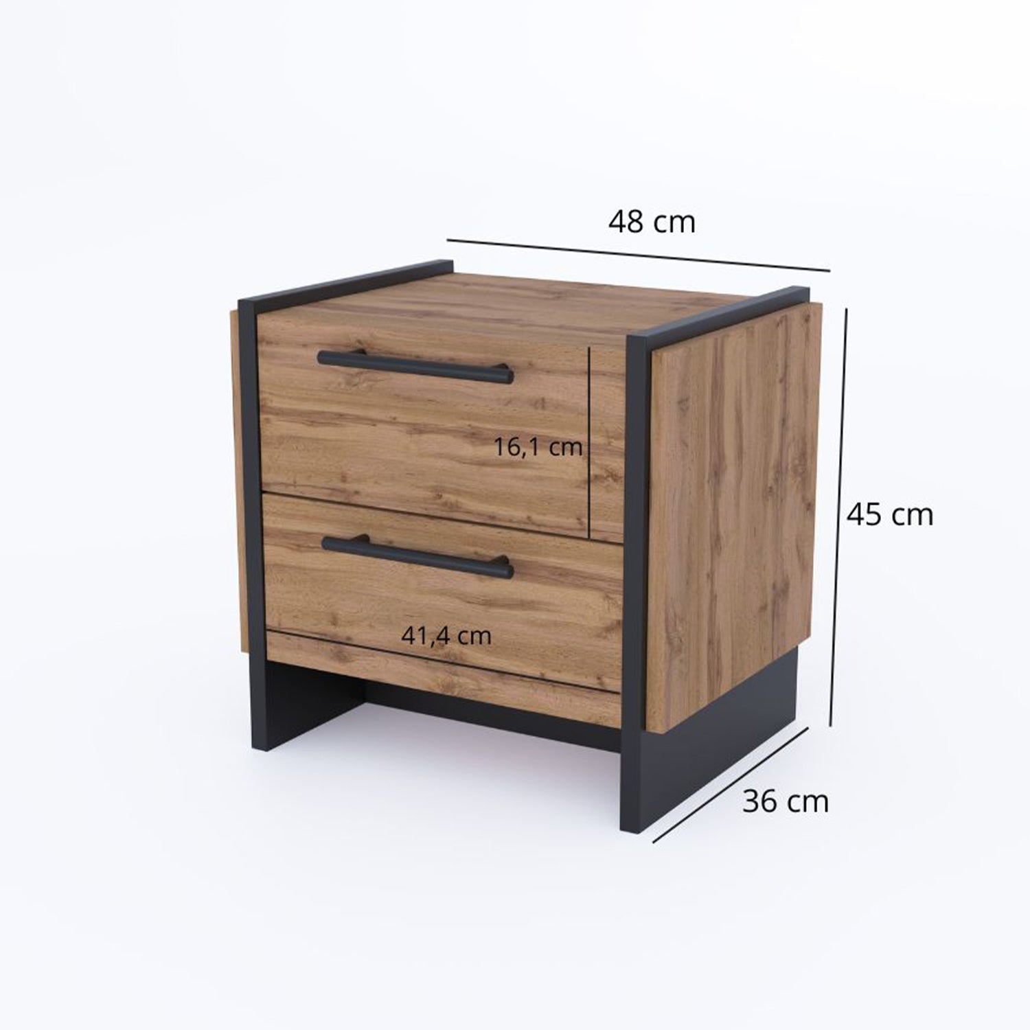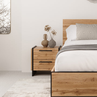 The Amino bedside table is the perfect complement to your dream bedroom. With its trendy wotan oak finish and black accents, it matches beautifully with the Amino bed. Spacious drawers and a top surface offer convenient storage for your night time essentials.