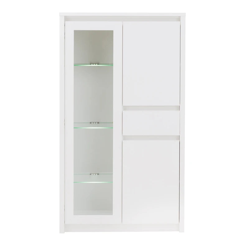 The display area can showcase decorative tableware, books, and decorative accents. The cabinet features three glass shelves for displaying items and one shelf in each of the two closed cabinets. A drawer is available for storing small items, and the unit is also equipped with an optional 3-point LED lighting system.
