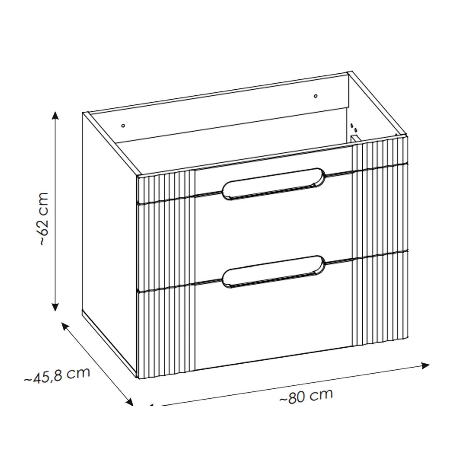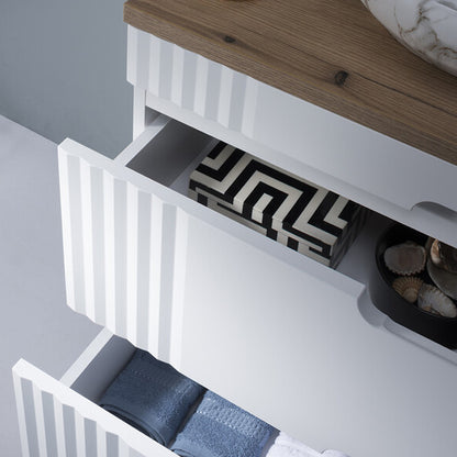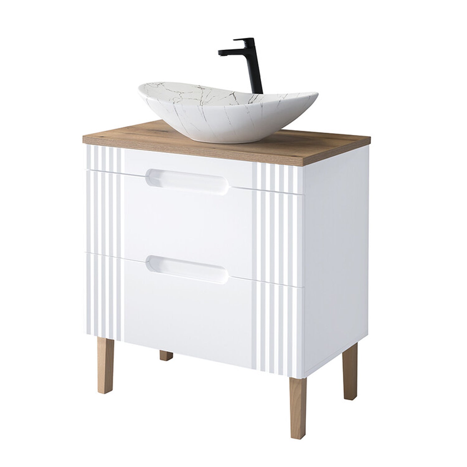 Introduce Scandinavian charm and refined design into your bathroom with the Fija Bathroom Cabinet Vanity 80 cm with Oval Basin. This freestanding unit features fluted detailing, integrated handles, and elevated legs for a light, modern aesthetic. The countertop supports an elegant oval basin, creating a stylish focal point while providing everyday functionality and smart storage.