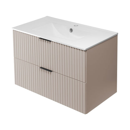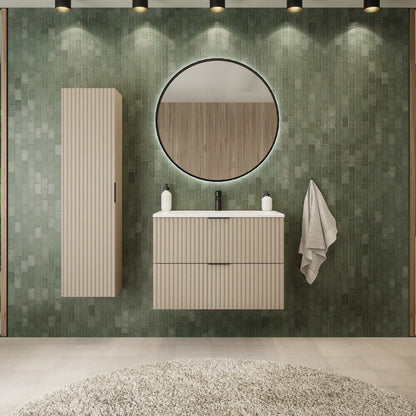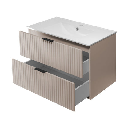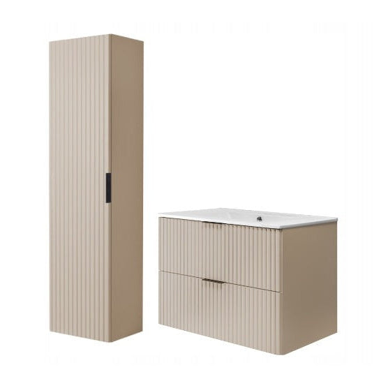 Add elegance and functionality to your bathroom with the modern Flow collection. Featuring stylish fluted MDF fronts, soft-close drawers, and a durable laminated body, this wall-mounted vanity set with a ceramic, rectangular bathroom sink and tall cabinet offers both beauty and practicality.