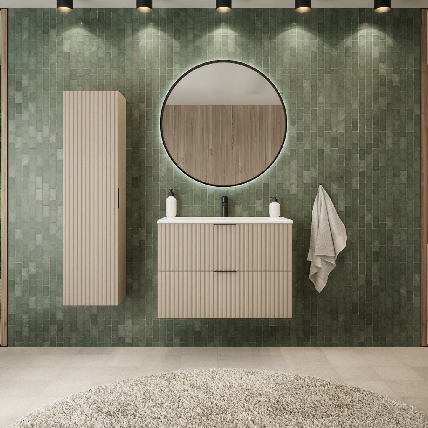 This set includes a wall-mounted cabinet 80cm, a basin and a tall cabinet. Please note that a mirror is not included.