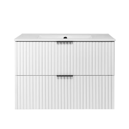 Our vanity cabinet comes equipped with a sleek, small ceramic rectangular sink that combines beauty with practicality, providing an ideal solution for your bathroom needs. Its size makes it a versatile addition, fitting seamlessly into both small and larger bathrooms.