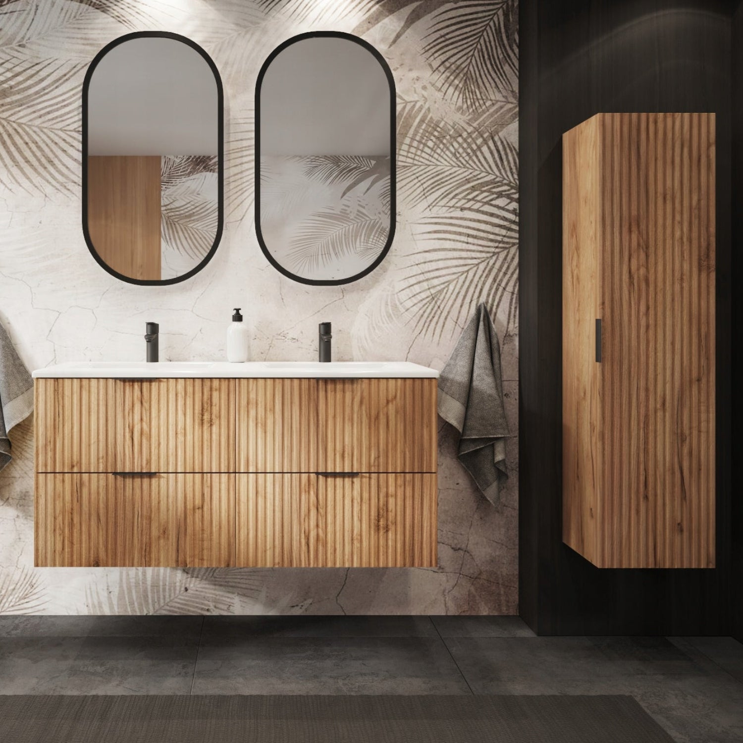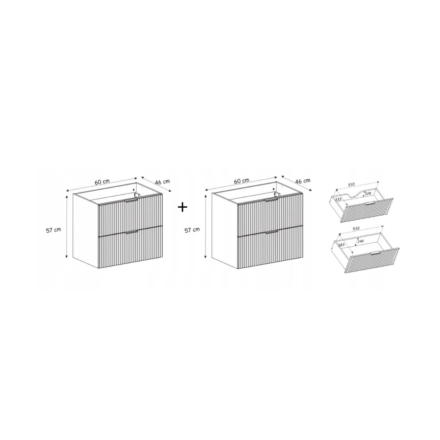 This set includes two standing cabinets, each 60cm wide, and two basins. Please note that a mirror and a tall cabinet are not included.