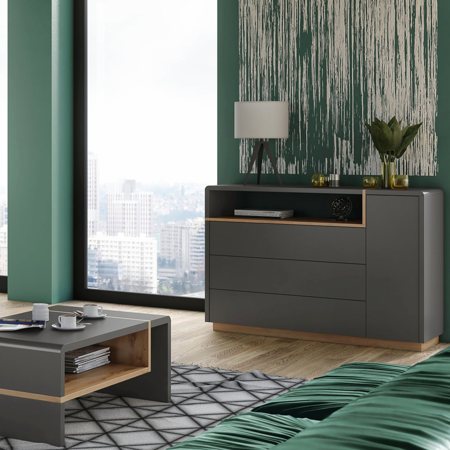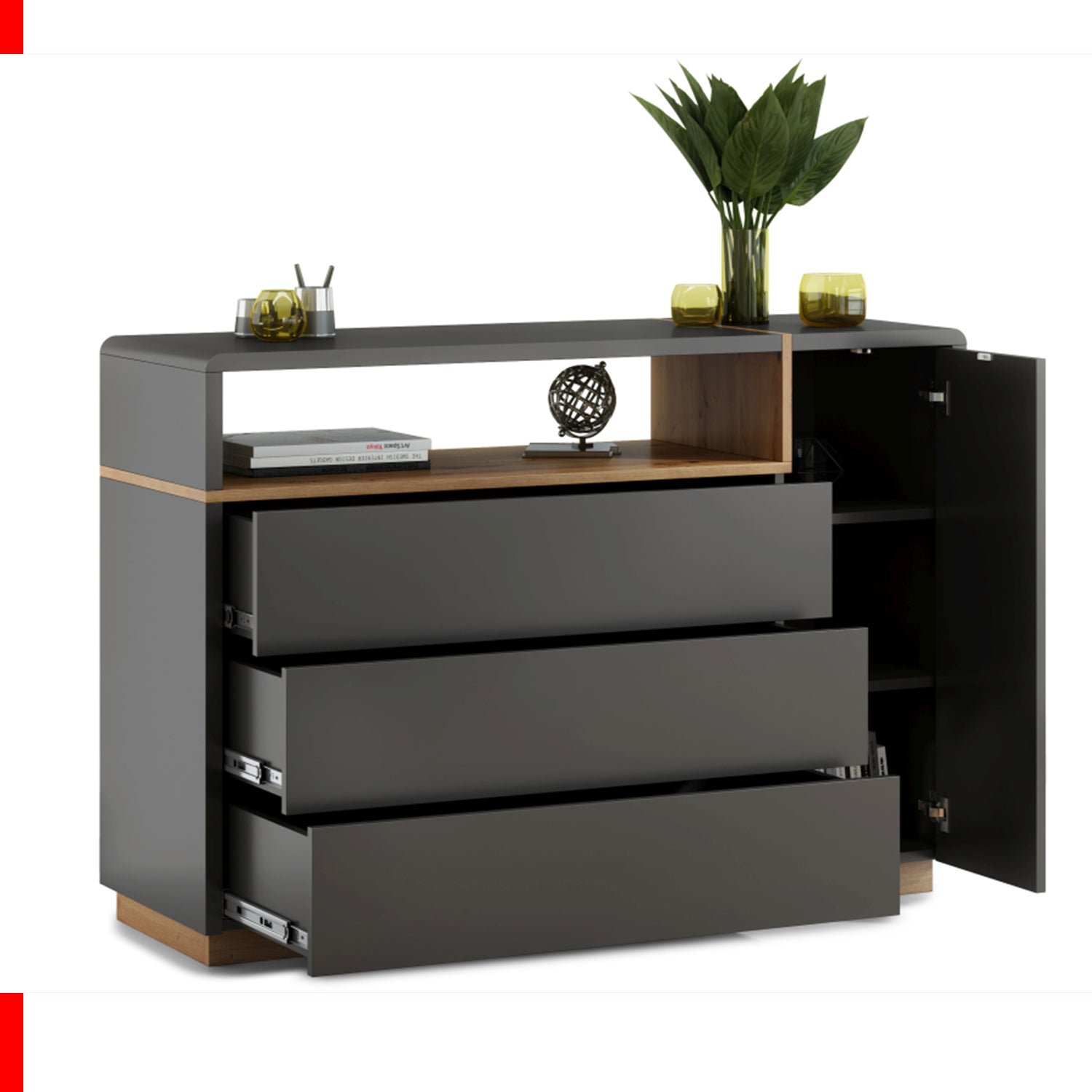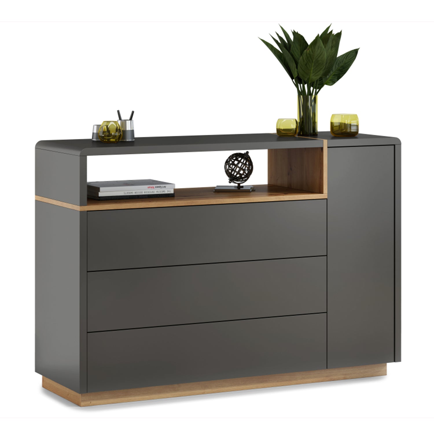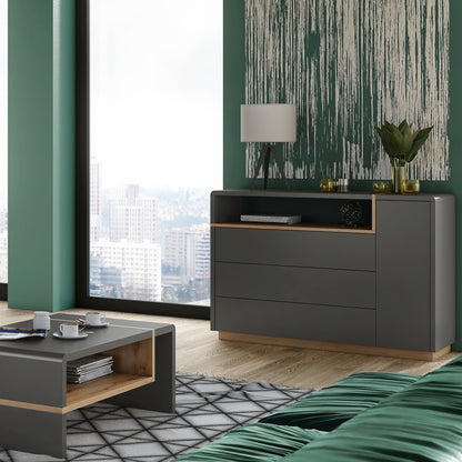 Folk Modern Loft Style Wide Sideboard with 3 Drawers and Open Display Shelf – Anthracite / Artisan Oak