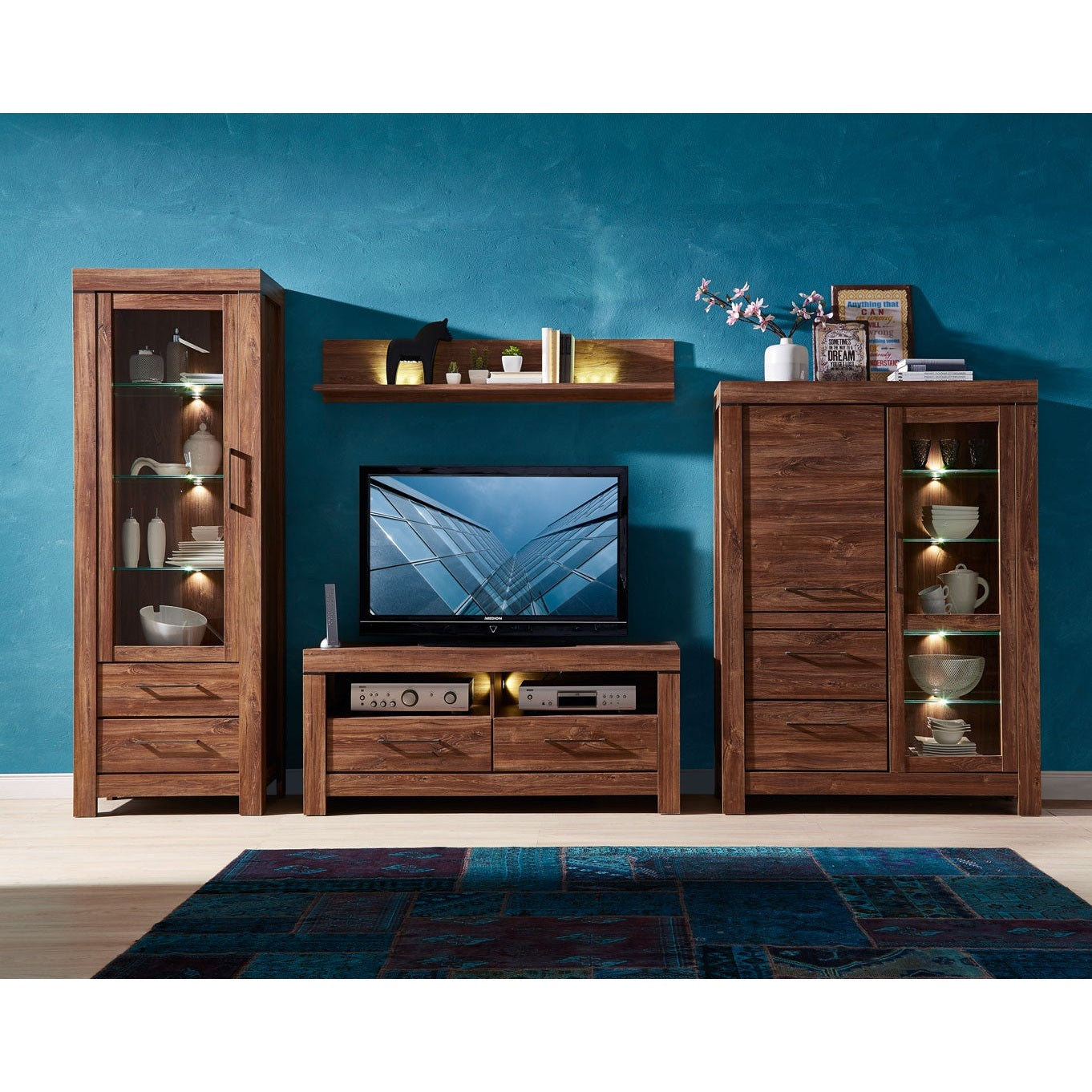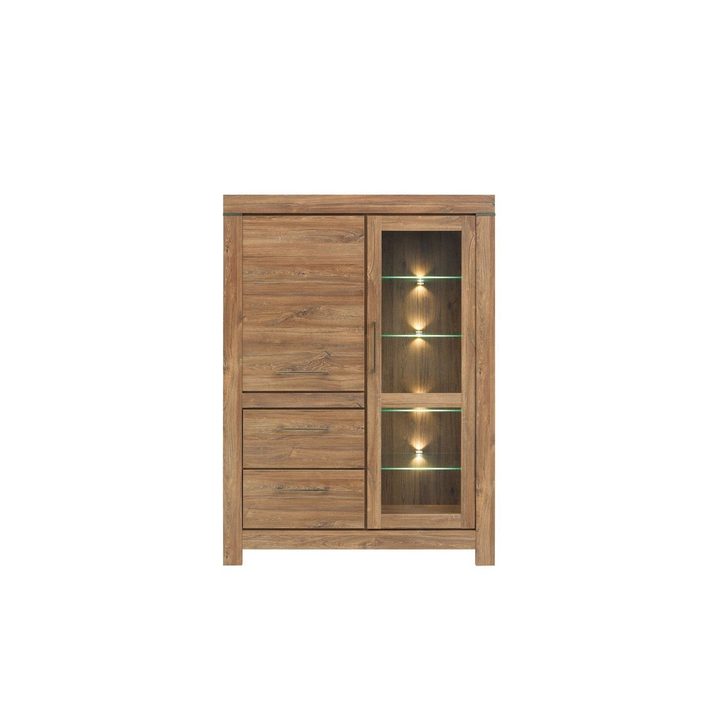 The Gent display cabinet REG1W1D2S combines style and functionality, making it a perfect addition to any living space. With a sleek Sterling Oak finish and glass doors, it elegantly showcases collectibles while protecting them from dust. It offers ample storage with one fixed shelf and two drawers. Made from high-quality materials, it ensures durability and long-lasting use.