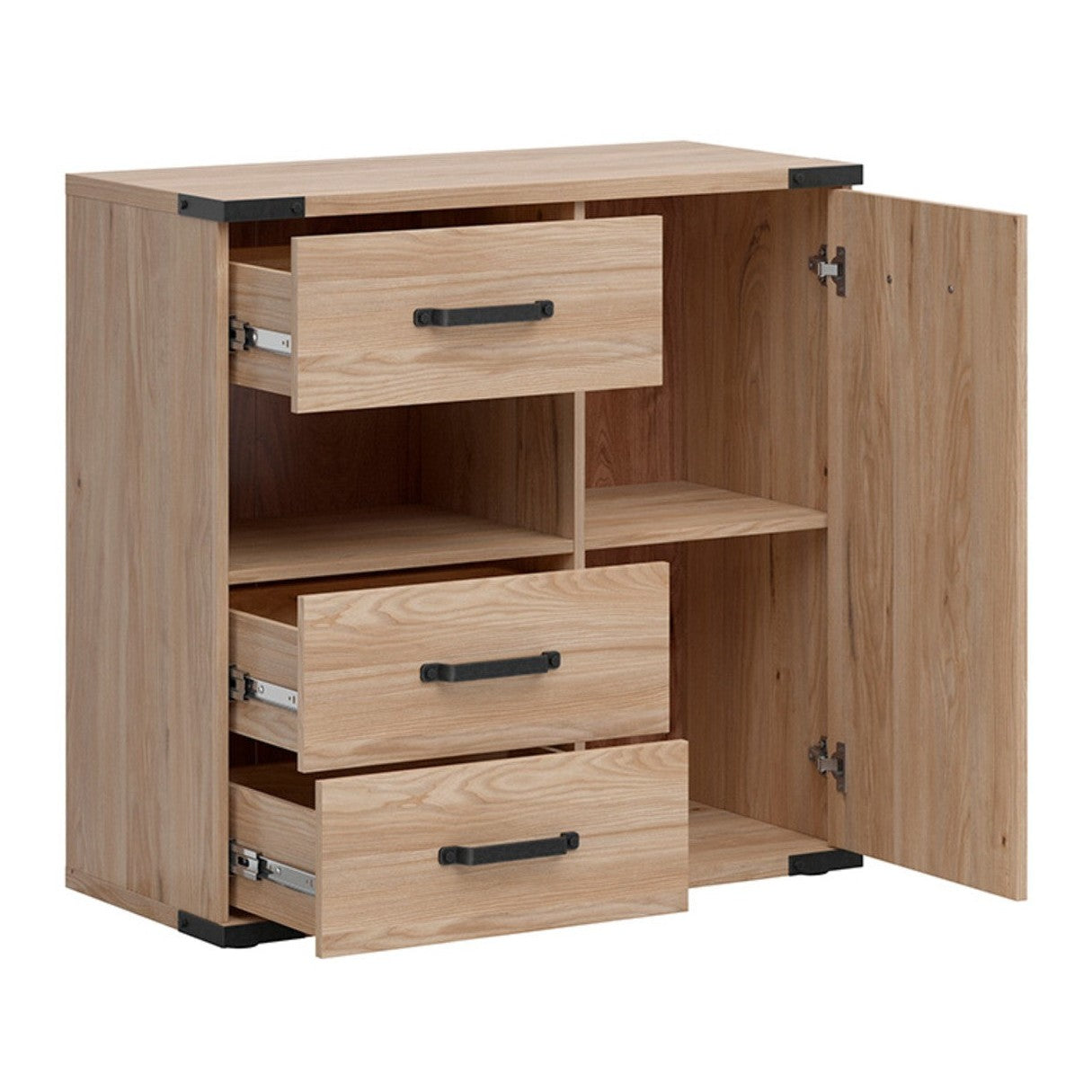 The Lara sideboard is a practical piece for a teenager’s room and home office. It features a spacious cupboard, three drawers, and an open area for small items. The sideboard in Belarus ash color with black handles and edge applications combines functionality and style. Soft-closing drawers and hinges ensure ease of use.