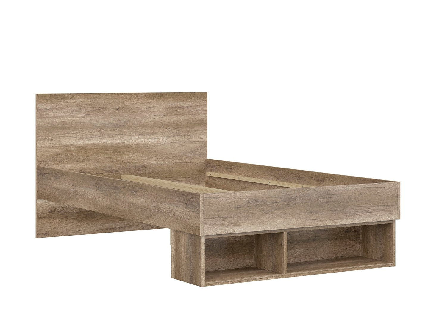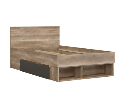 The Malcolm 120 cm youth bed is a practical choice for a child's room, featuring shelves for books and an optional drawer for bedding or toys. Its subtle canyon monument oak finish perfectly complements the rest of the collection, providing a great base for colorful accessories.