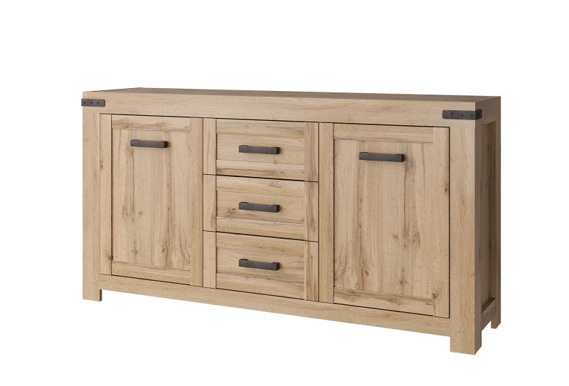The Mortiz 2D3S sideboard helps you organise all the essentials for your living or dining room. Its warm wood tone creates a cosy, homely atmosphere. Decorative strips on the front can be added to give the furniture a more rustic look, while the optional aged-effect fittings enhance its charm. The sideboard features four closed compartments for clothes, tableware, or documents and three drawers for smaller accessories. Each shelf can hold up to 5 kg.