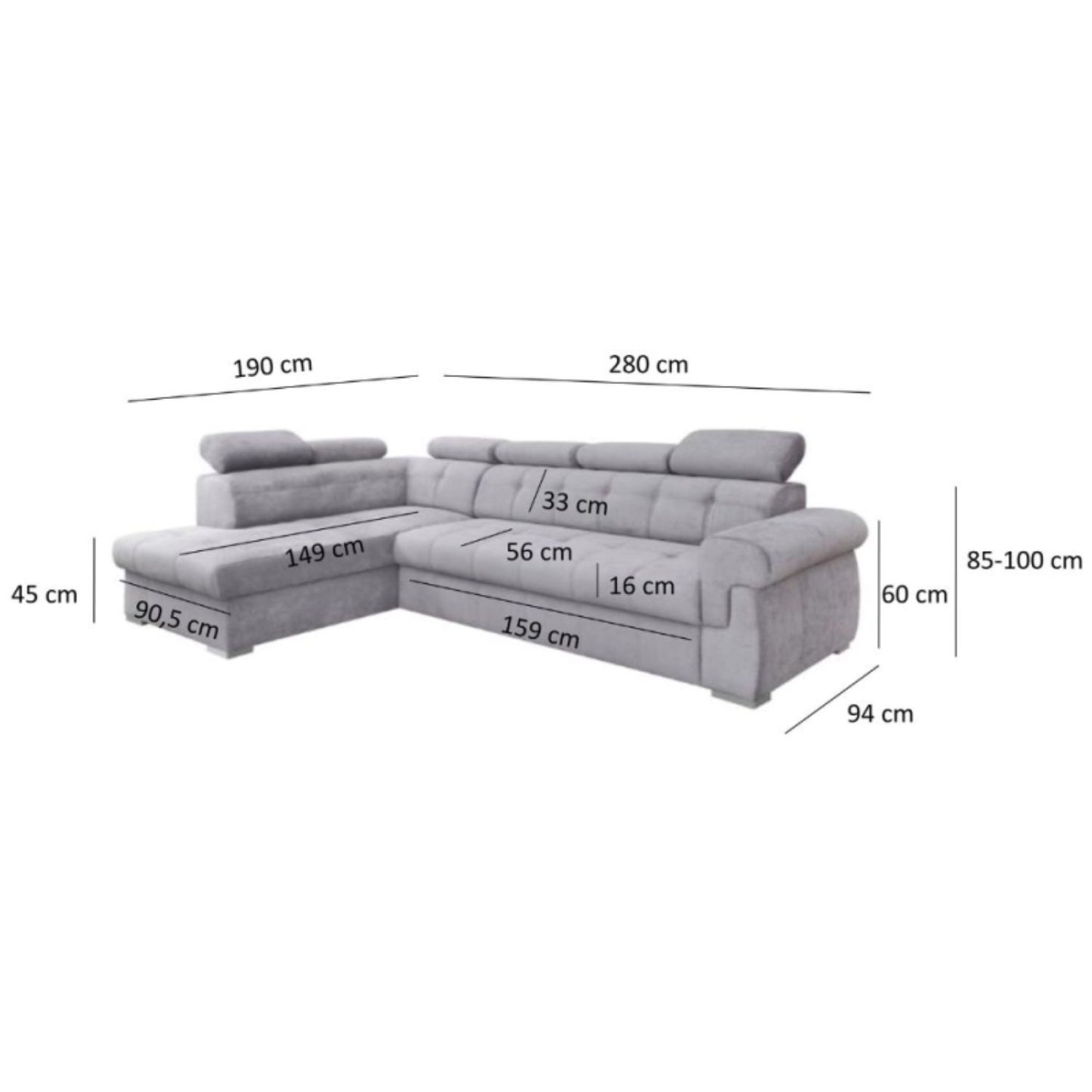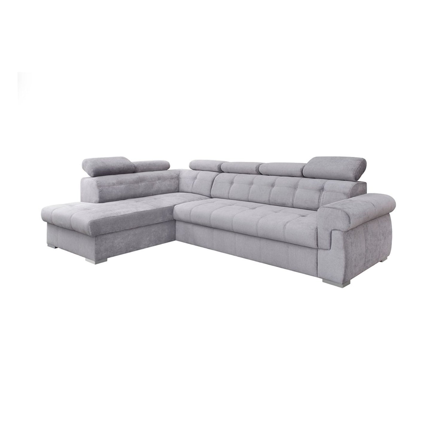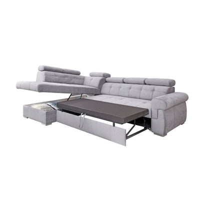 The Primo corner sofa is a modern and functional piece of furniture, perfect for the living room. It features a pull-out bed function, a storage compartment for bedding, and adjustable headrests. Filled with wave springs and foam, it offers everyday comfort. Available in both left- and right-hand versions. Great quality and style in one!