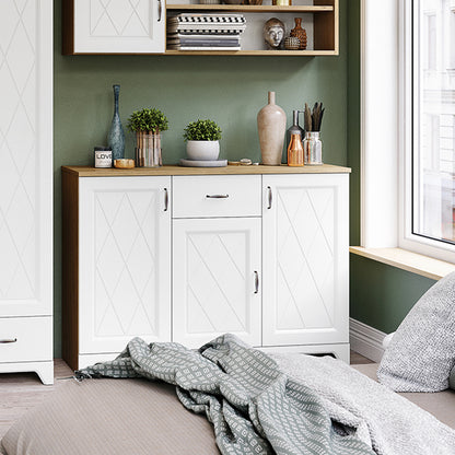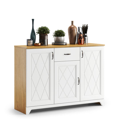 This sideboard brings Provençal charm with its stone oak and white matt finish. Featuring multiple drawers, it combines elegance with functional storage for dining or living areas.