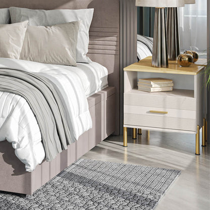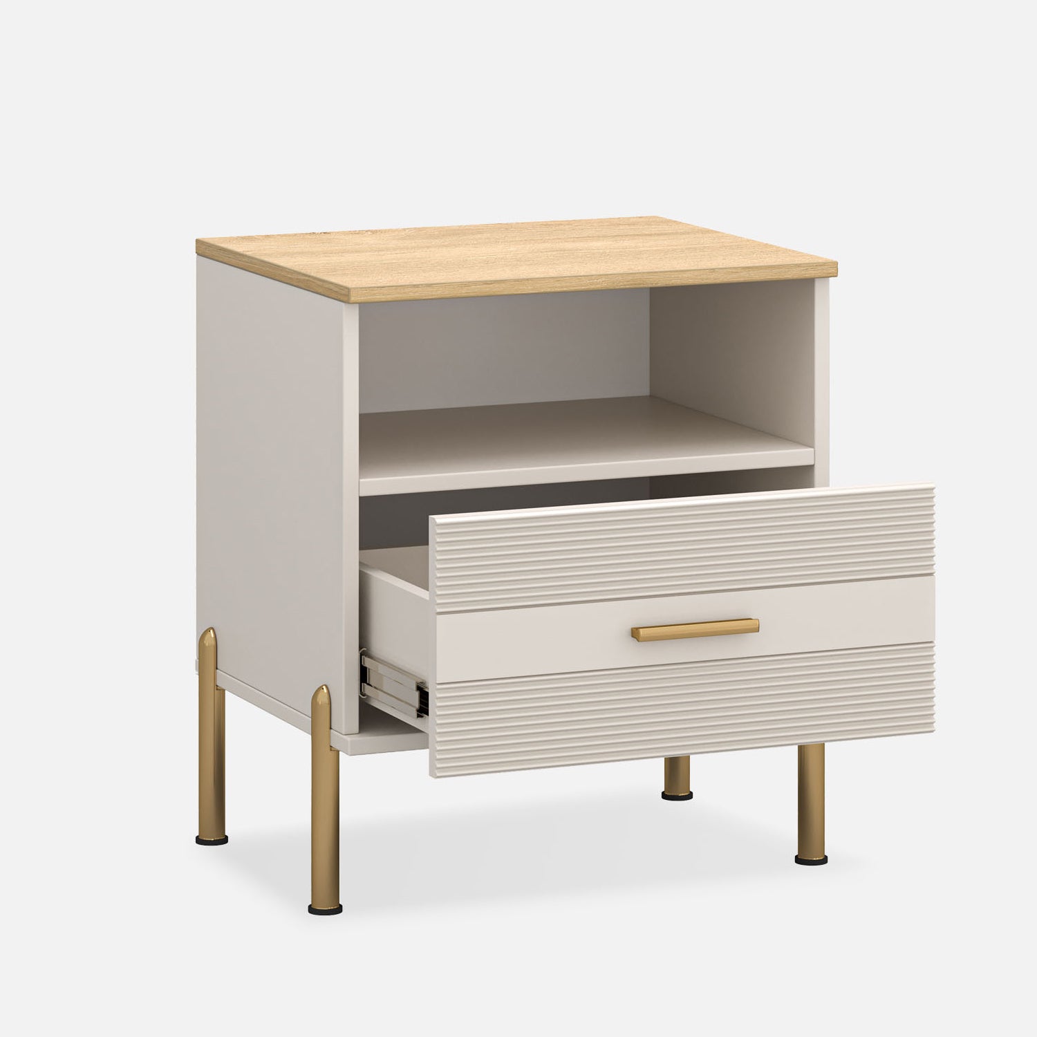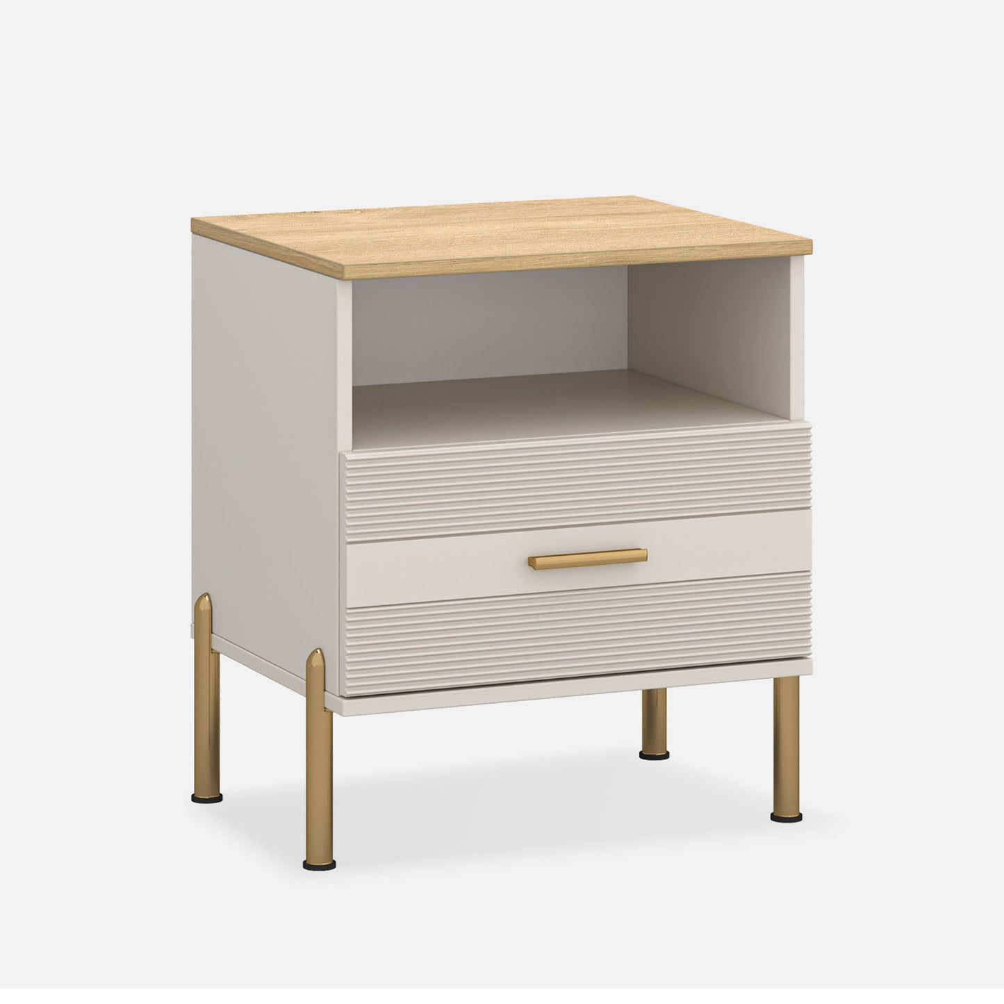 Keep essentials within reach with this Ruben bedside cabinet, featuring one spacious drawer. The cashmere and stone oak tones add warmth and style to any bedroom setting.