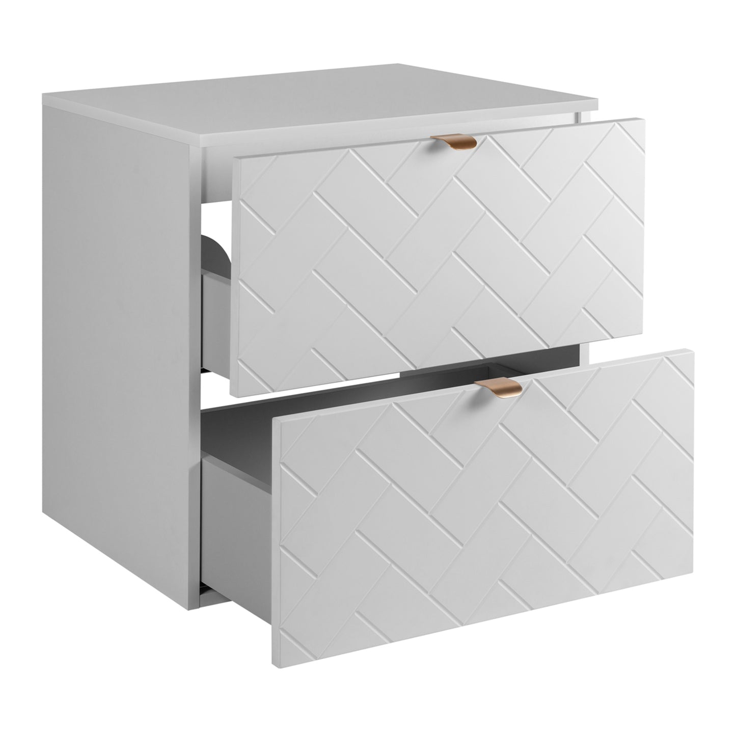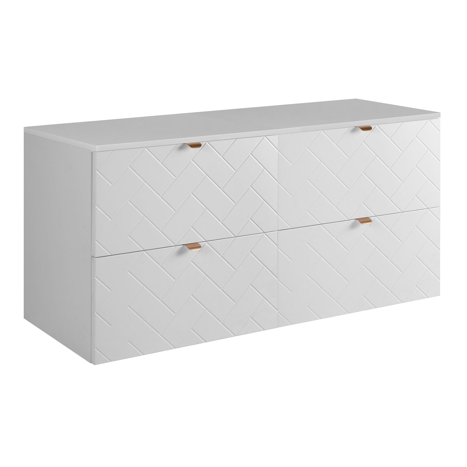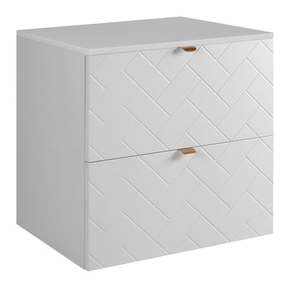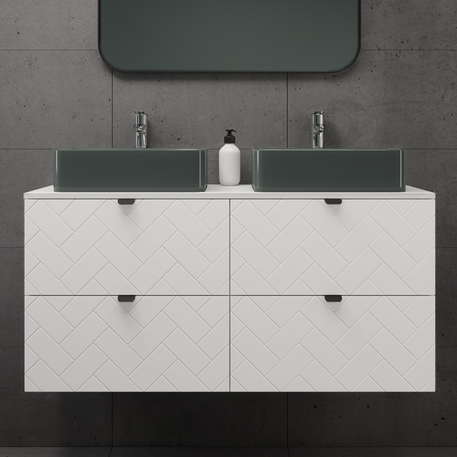 Add contemporary elegance to your bathroom with the Trend Herringbone Pattern Door 120cm Bathroom Cabinet Vanity Unit with Worktop. Featuring a sleek wall-mounted design and distinctive herringbone-textured drawer fronts, this unit blends craftsmanship with functionality. The doors are made from high quality MDF, ensuring long-lasting durability and a premium finish. With two spacious drawers and soft-close operation, this unit provides stylish storage for daily essentials. It also includes a set of 3 interchangeable handles in gold, silver, and black, so you can tailor the look to your taste.